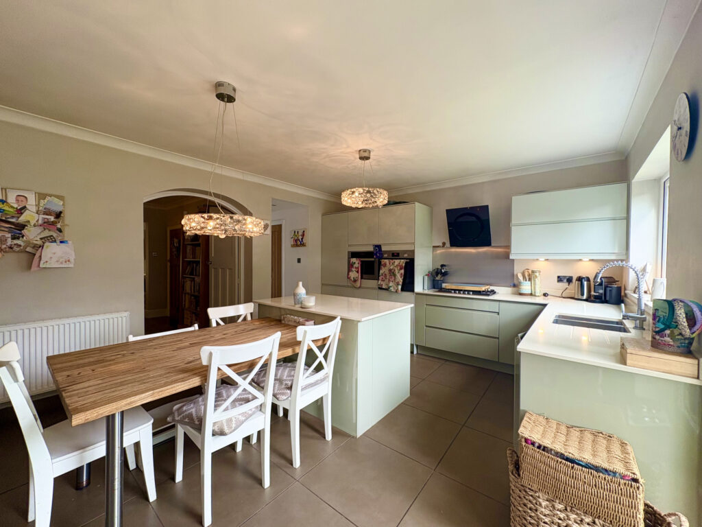 At the rear is a spacious fitted dining kitchen, this inviting space is ideal for hosting family gatherings or enjoying everyday life, with the added benefit of French doors opening onto the patio and private rear garden creating a seamless flow between indoor and outdoor living. The kitchen features an array of wall and base units, a convenient central island, and generous storage throughout. Integrated appliances include a fridge-freezer, built-in microwave and oven, 5 ring gas hob with extractor fan, dishwasher, and washing machine and would comfortably accommodate a large dining table.