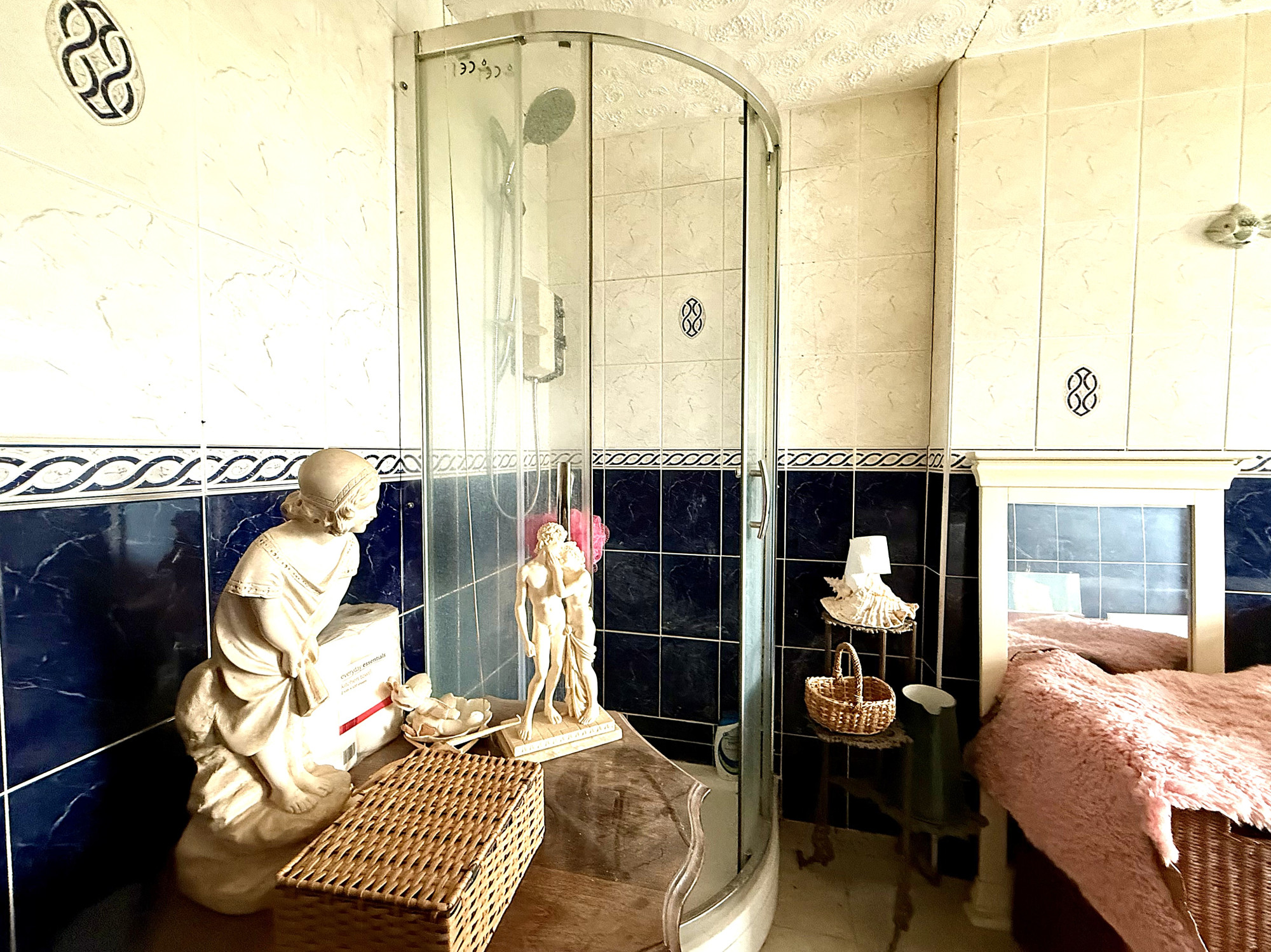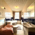 Ascend to the first floor to discover a generous, family-friendly layout. The master bedroom is double-sized and equipped with fitted wardrobes and a vanity. Bedrooms two and three are also double-sized, offering ample space for family, guests, or a home office. The main bathroom features a roll-top bath, a W.C., and a hand wash basin with storage beneath, plus a corner walk-in shower with sliding doors. Complementary tiling and chrome fixtures add a contemporary touch throughout. Completing the home is a large, family-sized space ideal for everyday living and entertaining.