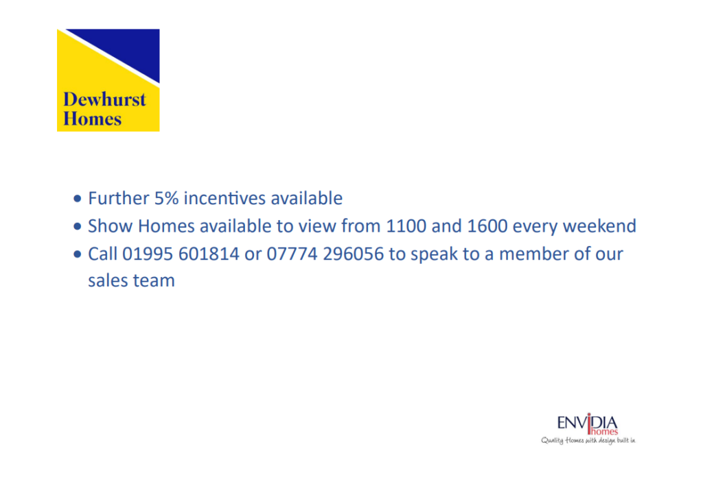 Call Dewhurst Homes on 01995 601814 to view this apartment. Showhome open from 1100 to 1600 on Saturday and Sunday, appointment not necessary.