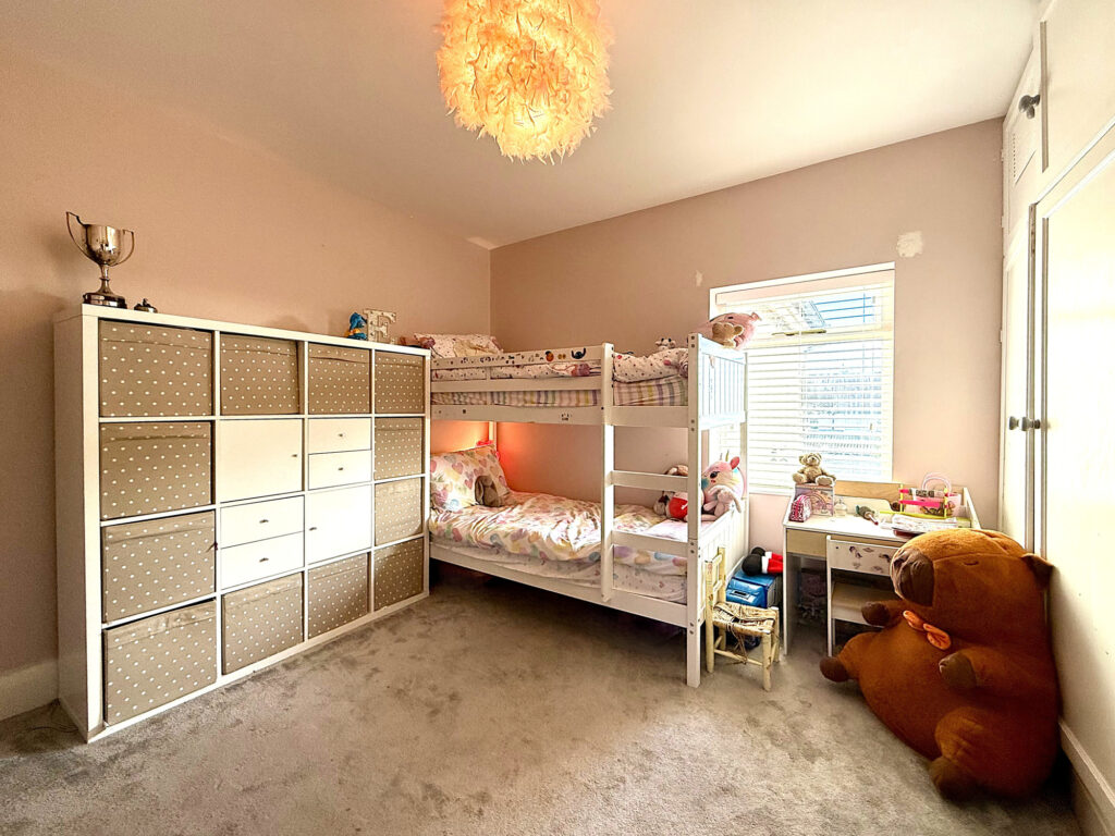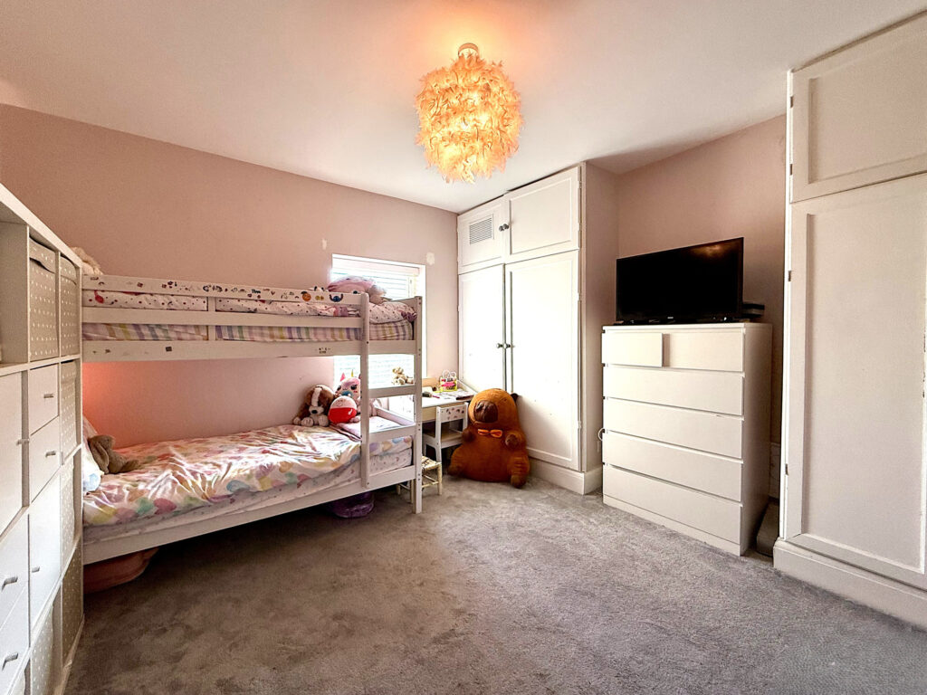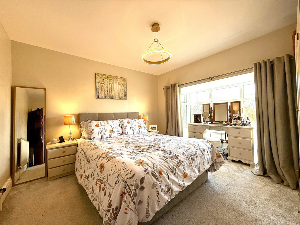 On the first floor, a spacious landing with a window to the side elevation opens to four well-proportioned bedrooms and a stylish bathroom. Bedroom one is a large front-facing double with a bay window, providing generous light and a pleasant outlook. Bedroom two offers built-in storage and overlooks the rear garden. Bedroom three is another double that also looks out onto the rear garden, while bedroom four provides a versatile single-sized space suitable for a variety of uses. Completing the floor is a four-piece family bathroom featuring a bath, a corner walk-in shower, a hand wash basin, and a WC, finished with complimentary tiling and chrome fixtures and fittings.