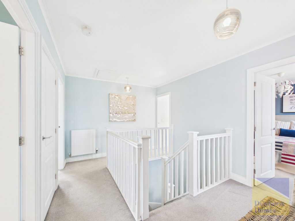 To the first floor, the sense of space continues with a striking galleried landing, adding a touch of elegance and openness rarely seen. The principal suite is particularly noteworthy, generous in size and beautifully appointed, it features a walk-in dressing area with fitted wardrobes and a stylish, contemporary three-piece ensuite, creating a true retreat within the home.