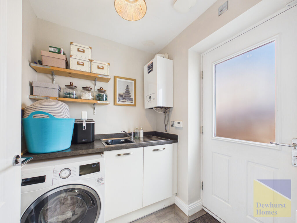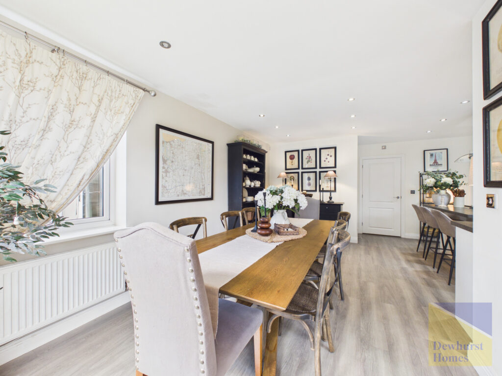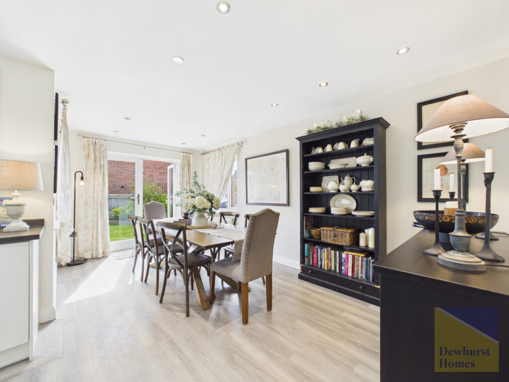 The dining area is equally impressive in scale, comfortably accommodating a large table and chairs, making it the perfect setting for family meals and entertaining alike. A second set of French doors leads directly out to the rear garden, allowing natural light to flood the space and enhancing the indoor-outdoor lifestyle this home offers. A separate utility room provides additional storage and dedicated space for laundry appliances, keeping the main living areas effortlessly organised.