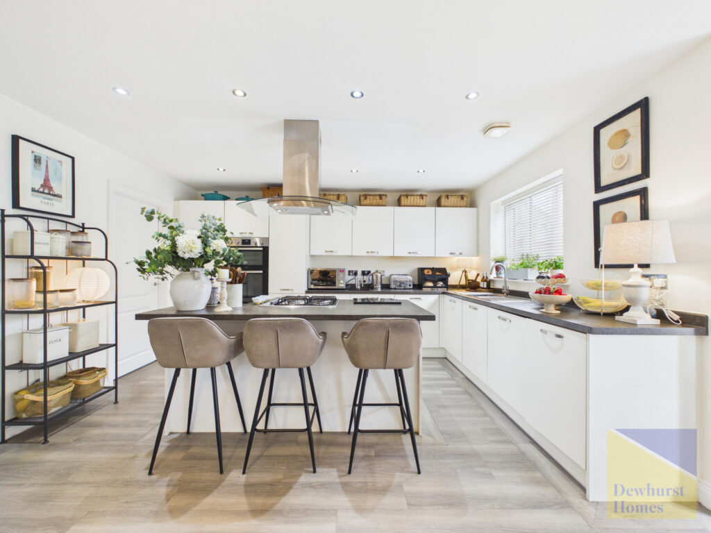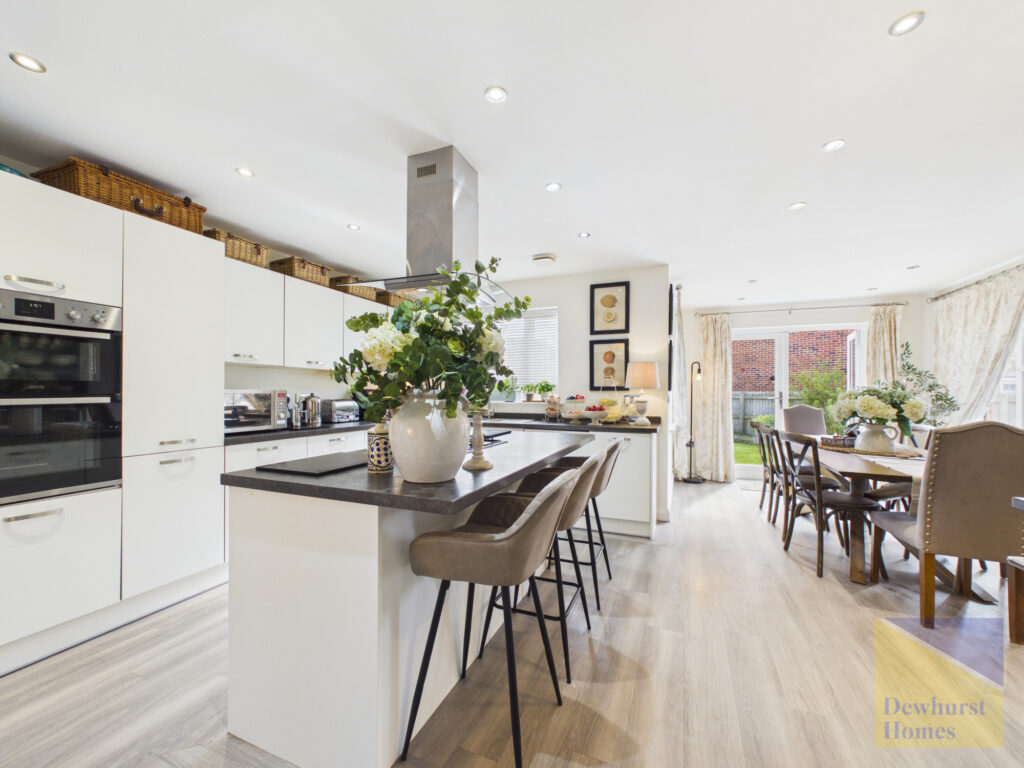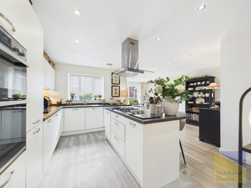 Undoubtedly the heart of this home is the stunning open-plan dining kitchen — designed with both everyday family life and social gatherings in mind. The kitchen is fitted with an extensive range of high-quality units, complemented by generous work surfaces and a central island featuring an inset gas hob with extractor above. Integrated appliances include a double oven and fridge/freezer, ensuring a sleek and cohesive finish.