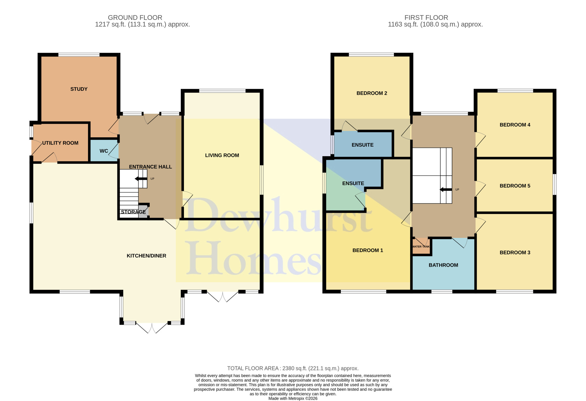 To the first floor are five generously sized double bedrooms, two of which benefit from en-suite facilities. The primary bedroom features a dressing area and a stylish four-piece en-suite bathroom, while bedroom two enjoys a three-piece en-suite. Three further double bedrooms are served by a contemporary four-piece family bathroom, completing the first-floor accommodation.