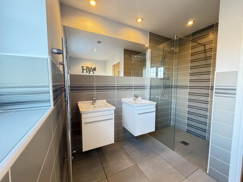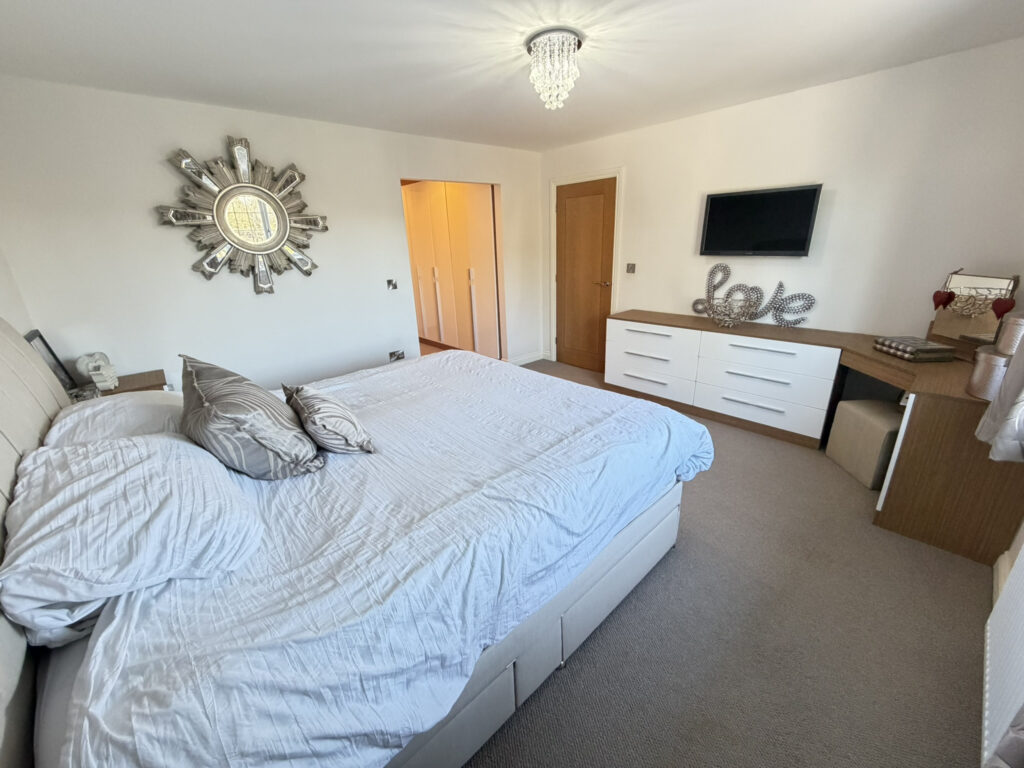 To the first floor are five generously sized double bedrooms, two of which benefit from en-suite facilities. The primary bedroom features a dressing area and a stylish four-piece en-suite bathroom, while bedroom two enjoys a three-piece en-suite. Three further double bedrooms are served by a contemporary four-piece family bathroom, completing the first-floor accommodation.