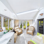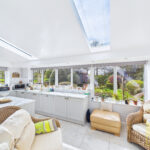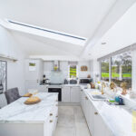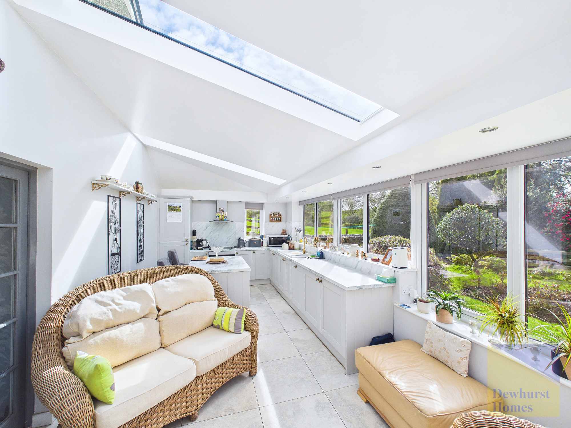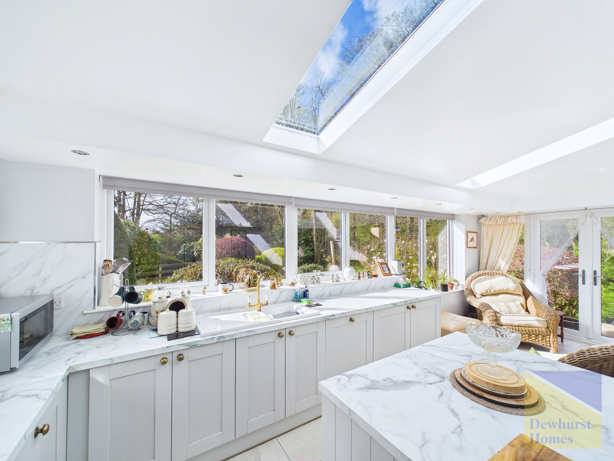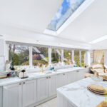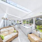 Internally, the property features anΒ orangeryΒ style kitchen and breakfast room, a stunning, light-filled space designed to blend indoor and outdoor living. The bespoke kitchen includes elegant white cabinetry, marble worktops, integrated appliances and a substantial central island with bar seating. French doors open directly onto the garden, and there is ample room for a dining table or a more relaxed seating arrangement.