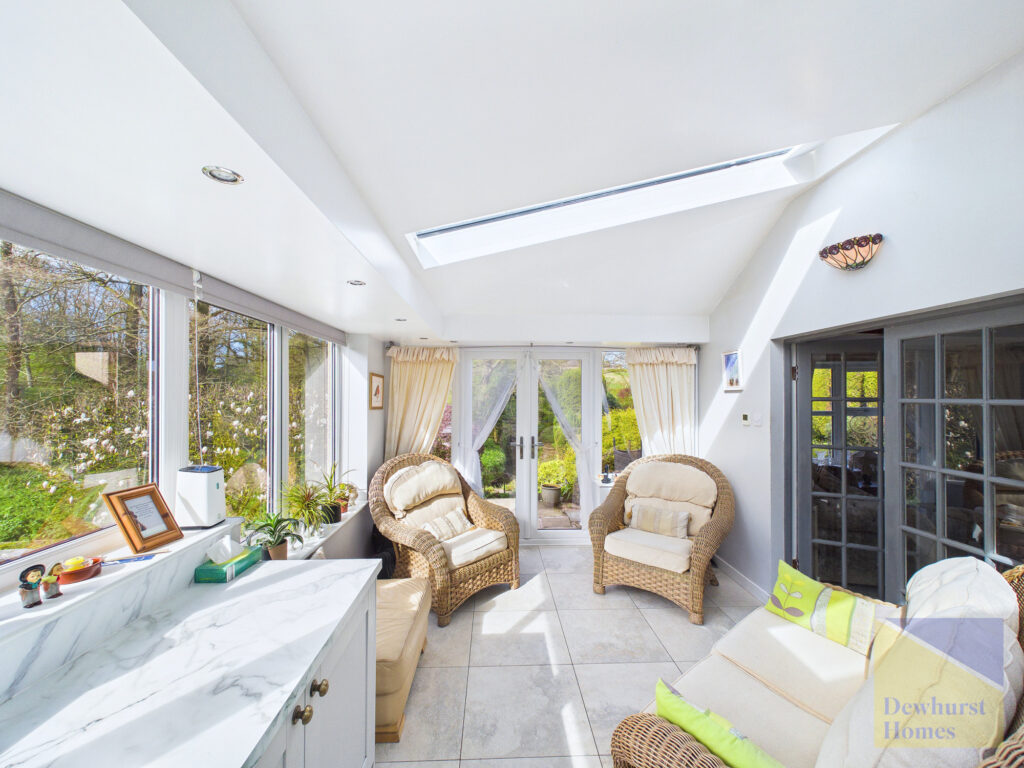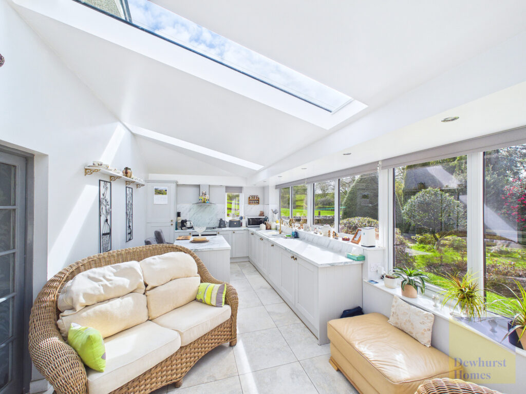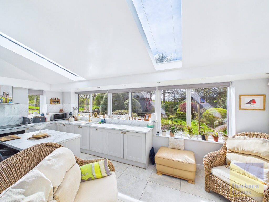An extended country property, perfectly positioned in a peaceful rural setting yet conveniently close to local amenities. Surrounded by rolling countryside and enjoying delightful views from every room, this charming home sits within generous, meticulously landscaped gardens featuring level lawns, mature planting, winding pathways and a pretty brook running along the boundary. The location offers the best of both worlds: tranquil country living with easy access to shops, schools and excellent transport connections.