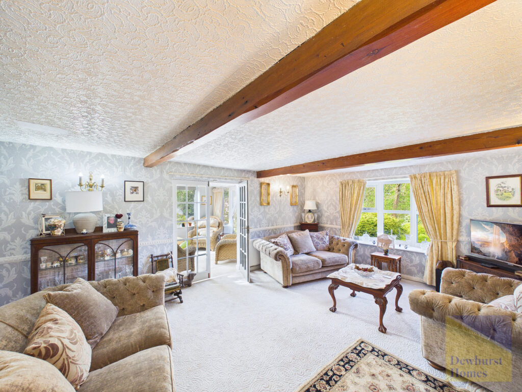 The elegant dual-aspect living room is a generous and welcoming space, complete with exposed beams, a feature fireplace and glazed double doors leading through to the kitchen, creating a wonderful flow for everyday living and entertaining. A spacious dining room, which also serves well as a second reception room, offers further versatility and charm with its exposed beams, character fireplace, front-facing window and external door.
