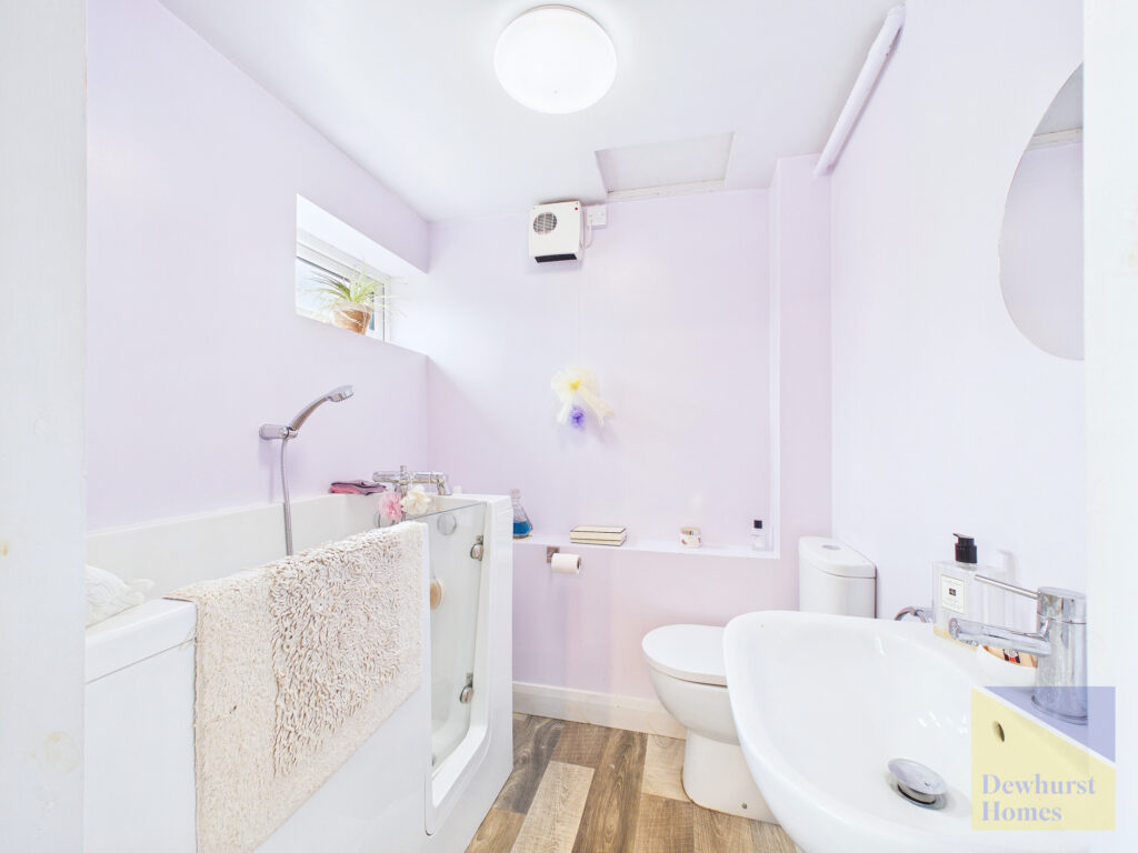 A large utility room provides extensive storage, a 1½ bowl sink, space for laundry appliances and a stable door opening to the garden. From here, a sliding door leads to a contemporary bathroom with walk in bath.