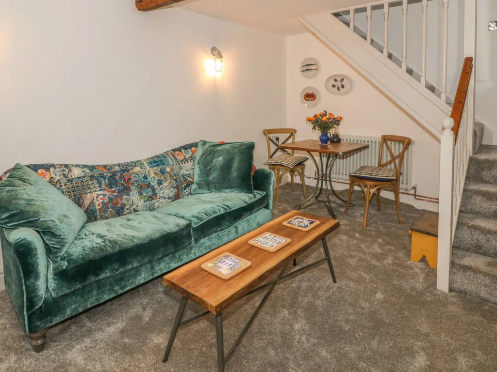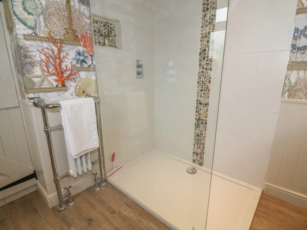 The kitchen has a range of fitted shaker style base units, reclaimed oak wall shelves and solid oak worktops, incorporating a butler style sink and electric ceramic hob and fan oven. A shaker wall unit houses the cottage’s Worcester gas combi boiler. Natural light is in abundance from a roof light in the ceiling which highlights the Karndean grey limed oak floor.