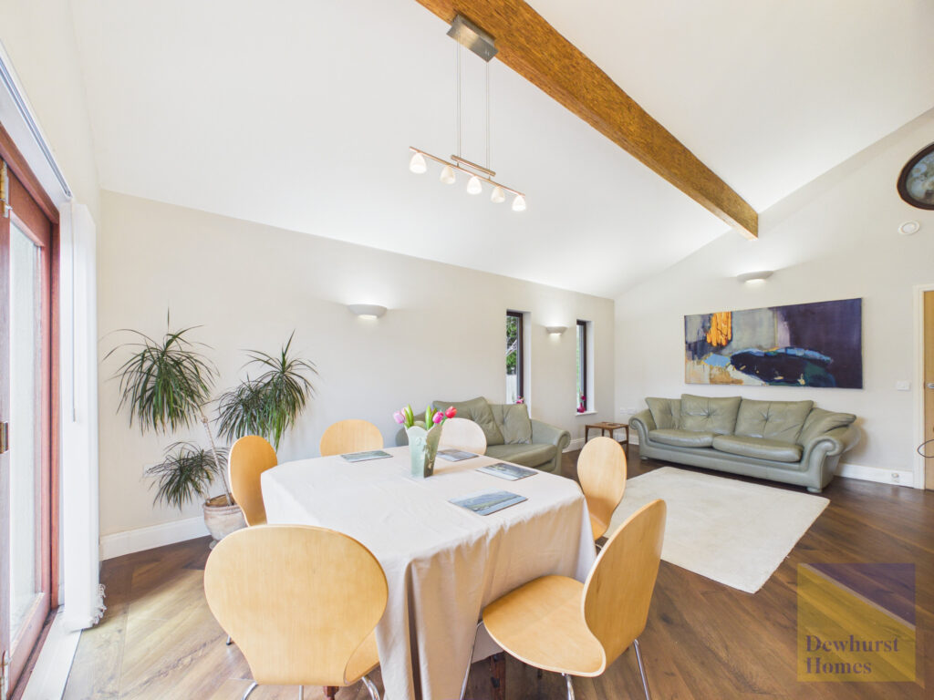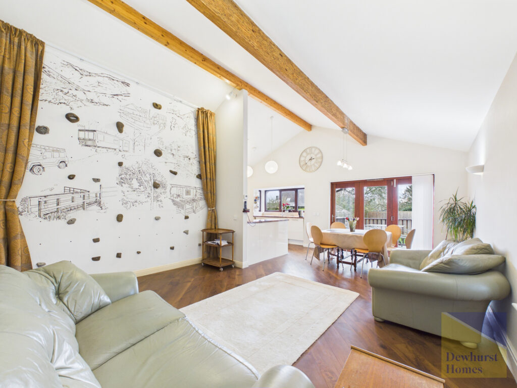 The main living accommodation is centred around an impressive open-plan living and dining room, a striking space enhanced by a feature vaulted ceiling that creates a wonderful feeling of volume and light. This room forms the social heart of the home, perfect for both everyday living and entertaining. From the dining area, French doors open directly onto an attractive covered veranda, providing a seamless connection between indoor and outdoor living. This space is ideal for al fresco dining, relaxing with friends, or enjoying the garden throughout the seasons.