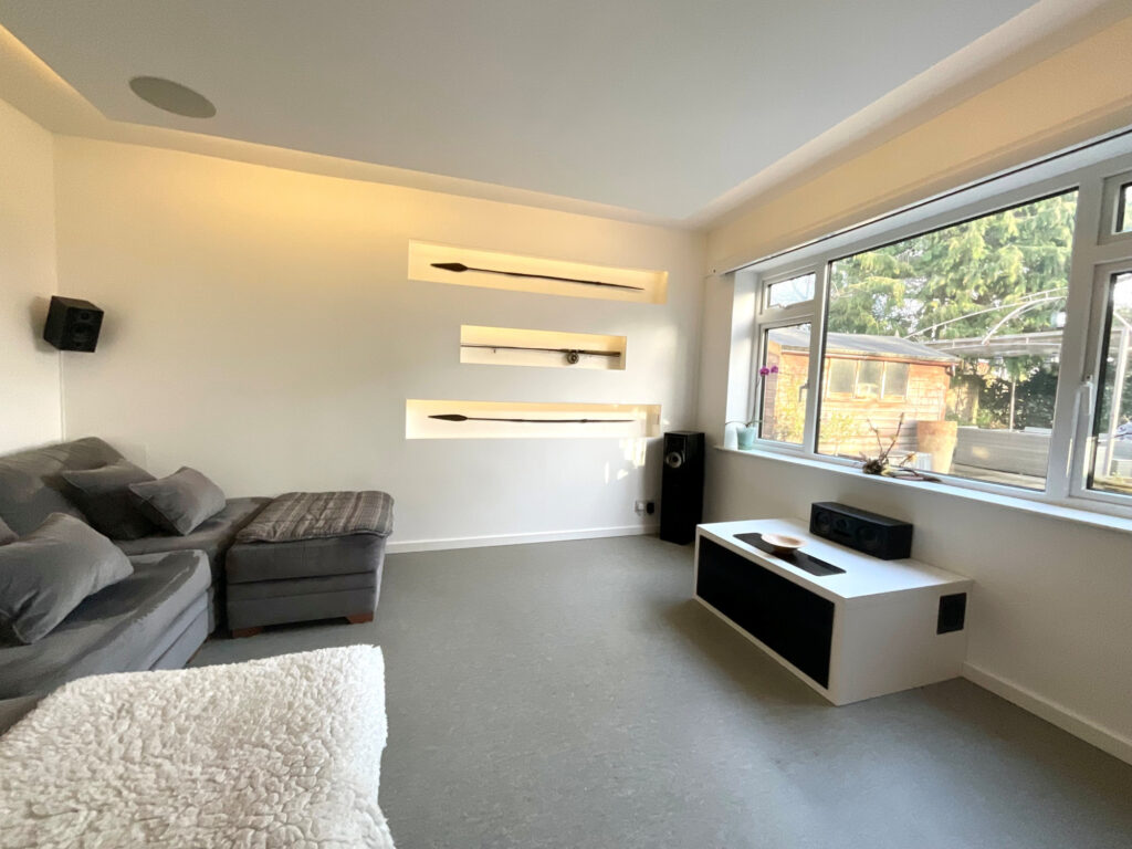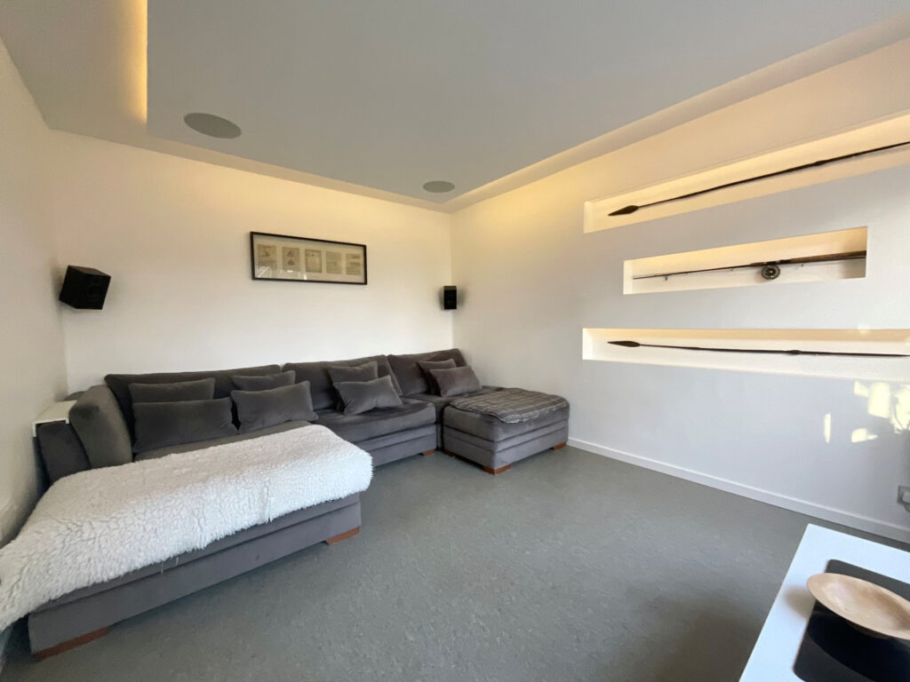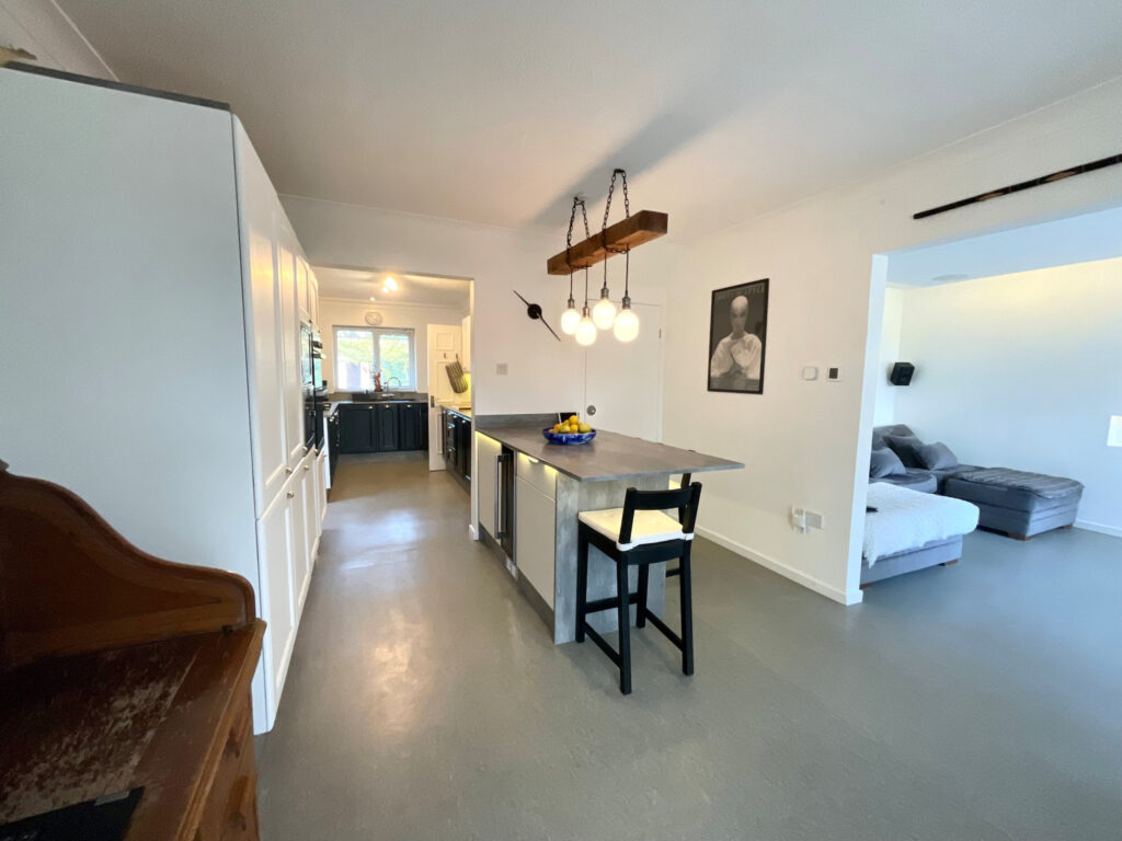 At the heart of the property lies the stunning open-plan kitchen, dining and lounge area, immaculately finished to an exceptional standard. The kitchen is fully equipped with an array of premium integrated appliances and smart kitchen gadgets, including a gas hob with an additional induction booster, wine cooler, double oven and more. Marmoleum hard-wearing flooring adds a sleek and practical finish. The lounge area offers a fantastic touch of modern luxury with its built-in projector screen, providing a cinema-style experience while maximising space.