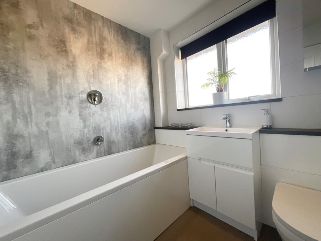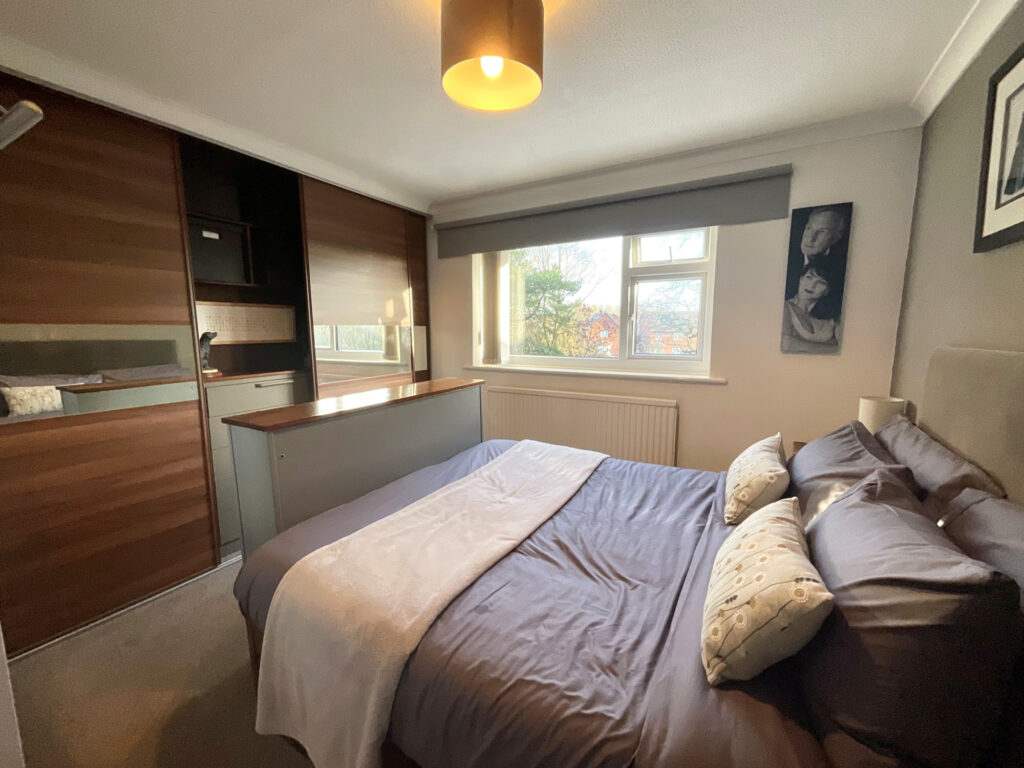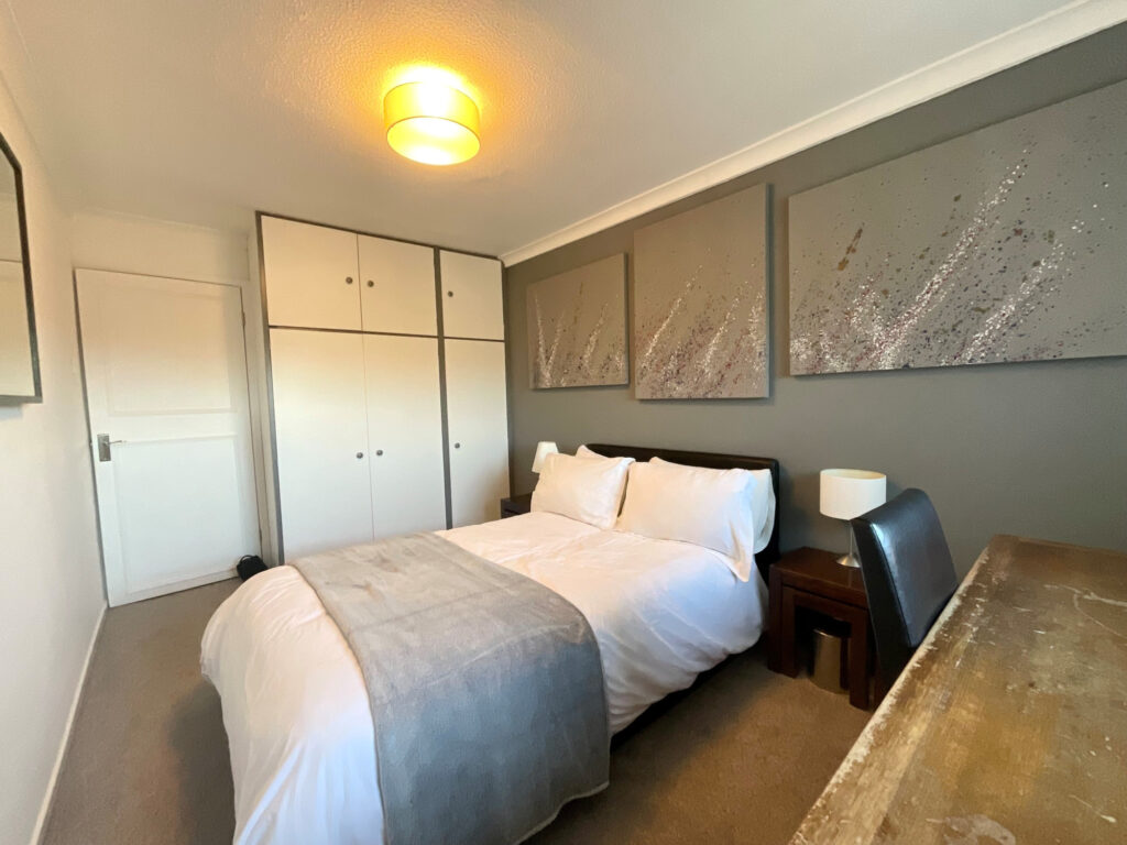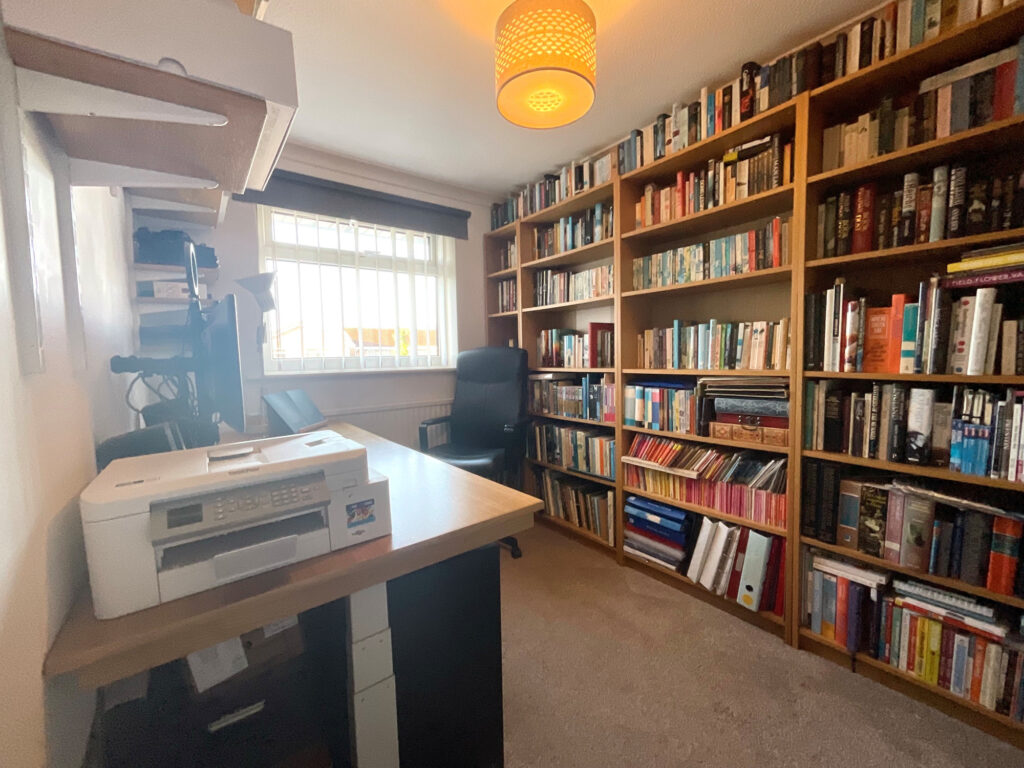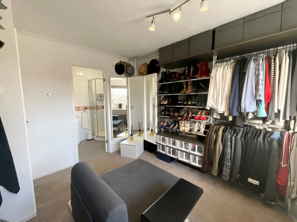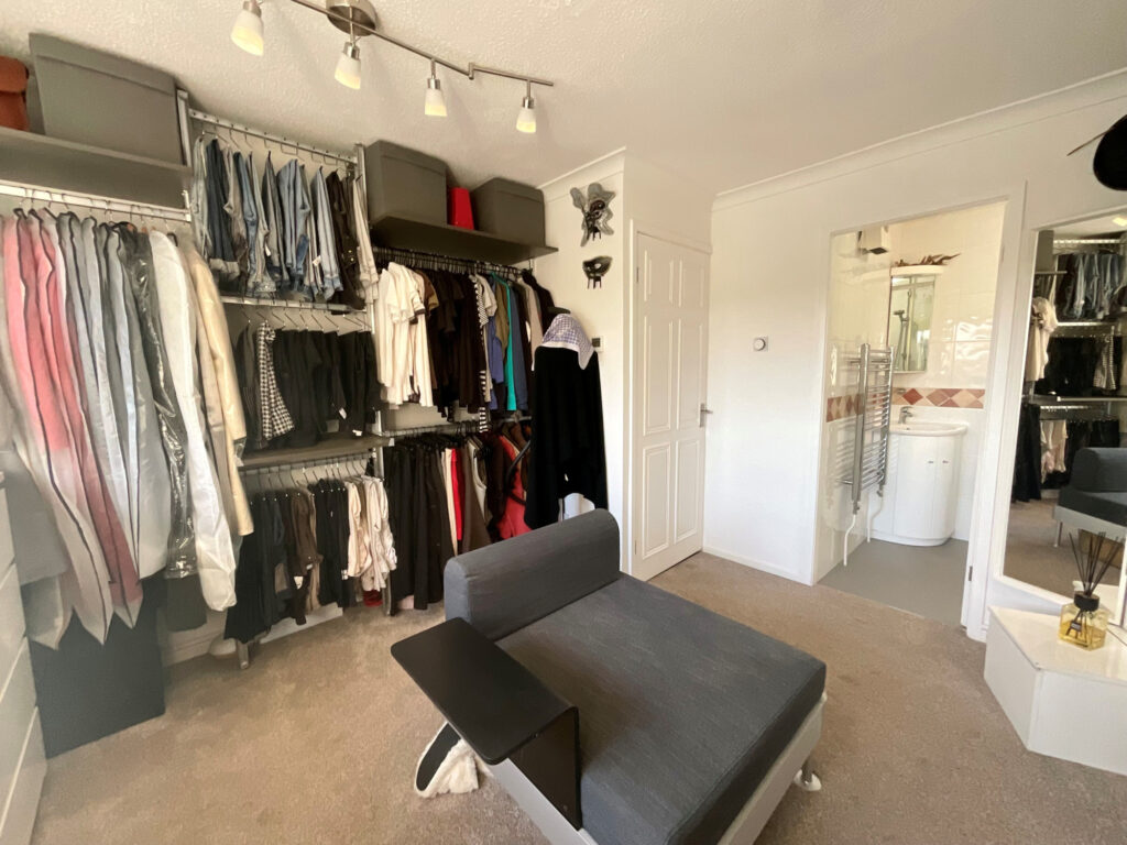 Upstairs, the property boasts four generously sized double bedrooms. The smallest is currently used as a stylish office/library, offering versatility for home working or quiet reading. The main bedroom is beautifully arranged as a dream dressing room, fitted with shelves and clothes rails, and features a private en-suite equipped with a corner shower, vanity unit and heated towel rail. The remaining two bedrooms are spacious doubles, all immaculately presented and complemented by fitted wardrobes. A useful landing storage cupboard contains additional shelving and access to the upper section of the laundry chute. Completing the first floor is a luxurious family bathroom, fully tiled in high-gloss white with elegant glass tile features that enhance natural light across the landing.