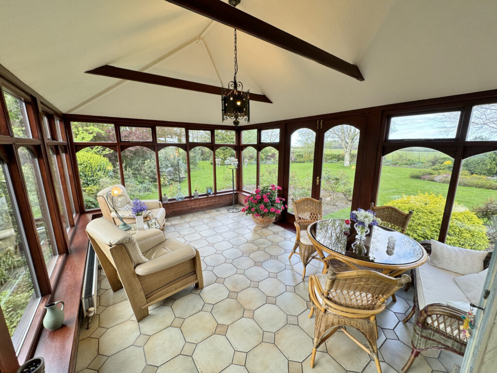 Step inside, and you'll discover a thoughtfully laid-out floor plan designed for seamless living. The entrance hallway welcomes you with warmth, leading to a handy cloakroom for added convenience. The front-to-back lounge features a charming fireplace, creating a cozy ambiance for relaxation. The dining room boasts a striking barn window, adding character and charm to the space, while the study offers a quiet retreat for work or hobbies. The fitted breakfast kitchen is a culinary haven complete with modern amenities. A utility room provides additional practicality. The conservatory is a perfect all year round room with a solid insulated roof and fully heated. this relaxation space seamlessly blends indoor and outdoor living.