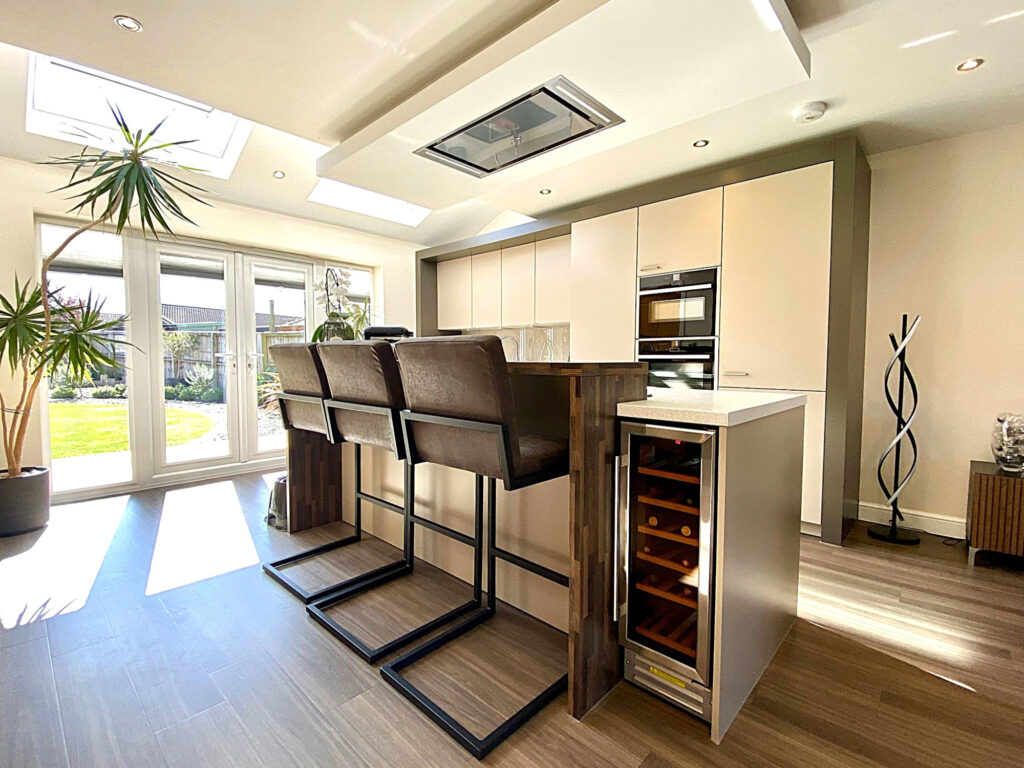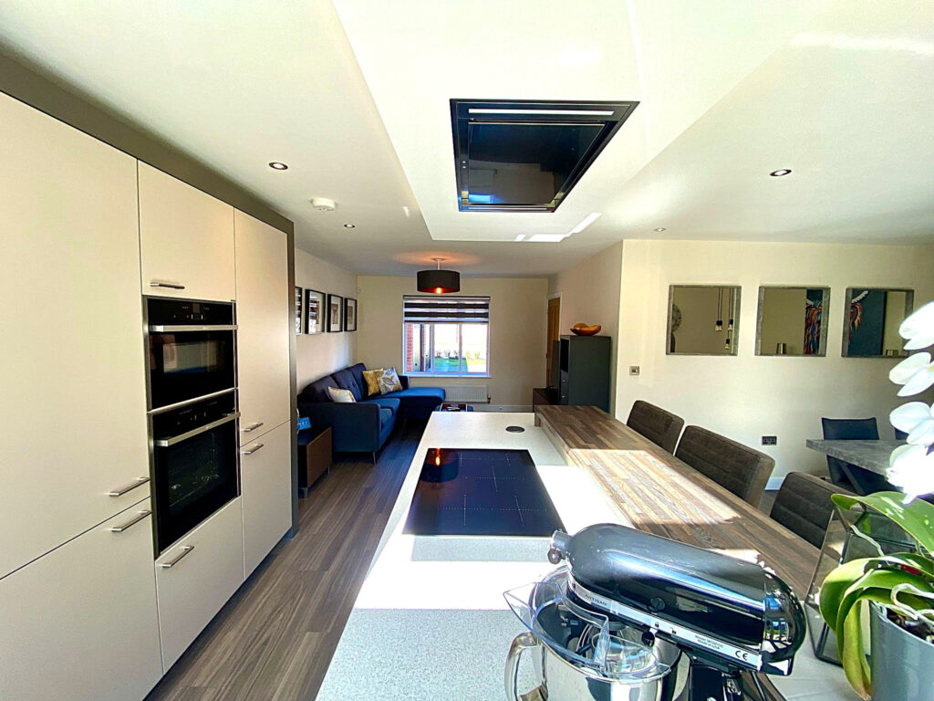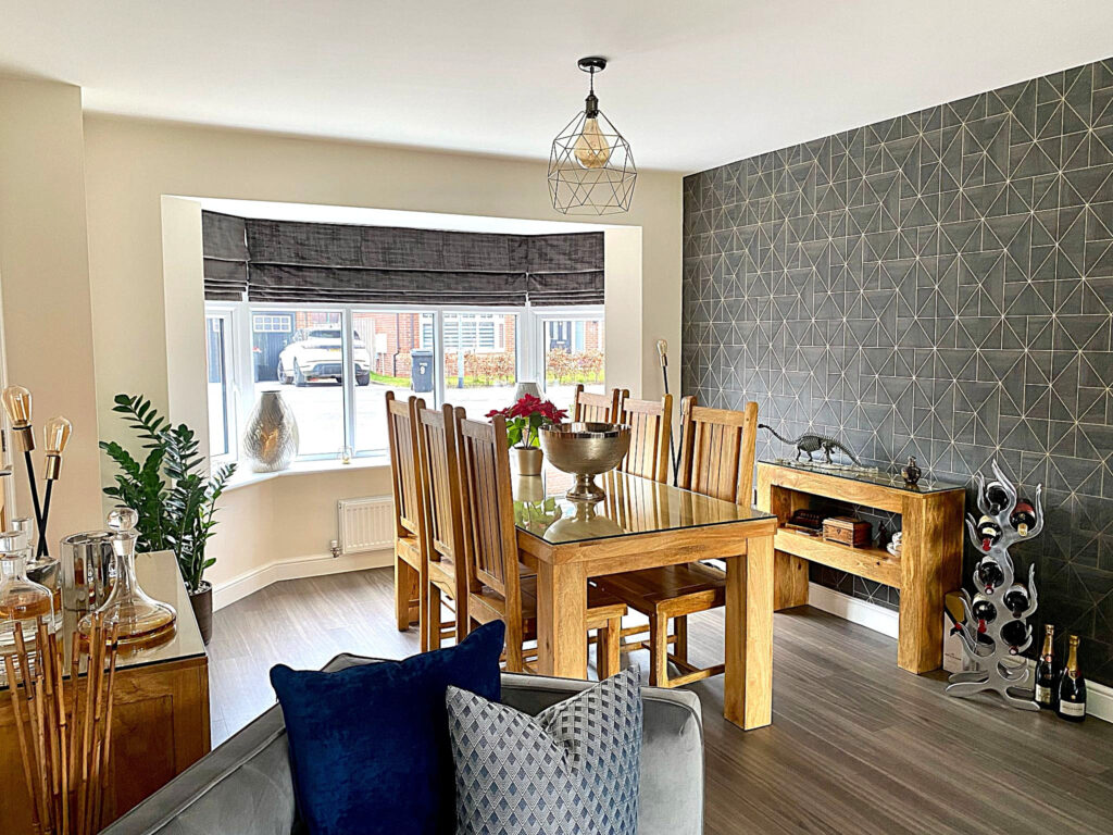 Enter this charming home through a modern composite front door, welcoming you into a spacious hall that seamlessly provides access to all ground floor rooms and the first floor. A convenient W/C is thoughtfully positioned nearby for ease of use. The bright family-sized lounge beckons with its inviting ambiance, featuring a beautiful bay window that floods the space with natural light. Patio doors provide a picturesque view of the rear garden, creating a perfect connection between indoor and outdoor living. The heart of the home lies in the expansive kitchen/dining/family room, where functionality meets elegance. This well-appointed space boasts stylish SieMatic units, high-quality NEFF appliances, and a wine fridge, catering to both culinary enthusiasts and entertainers alike. The functional island is not only a practical workspace but also includes pop-up power sockets with built-in wireless phone charging, ensuring that your devices are always ready to go. Enjoy your favourite tunes with the integrated Bluetooth speaker and set the mood with the remote control extractor featuring changeable ambient lighting. French doors open up to the rear garden, enhancing the sense of light and space, while Velux windows further elevate the room’s brightness. Access to the utility room adds convenience to your daily routines. Throughout the ground floor, Amtico flooring offers a sleek and durable surface, harmonizing with the home’s modern aesthetic. Upgraded security locks provide peace of mind, ensuring that your sanctuary remains a haven of safety.