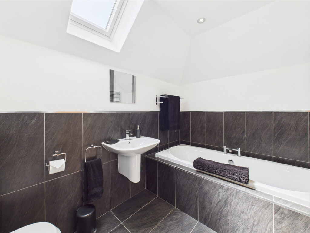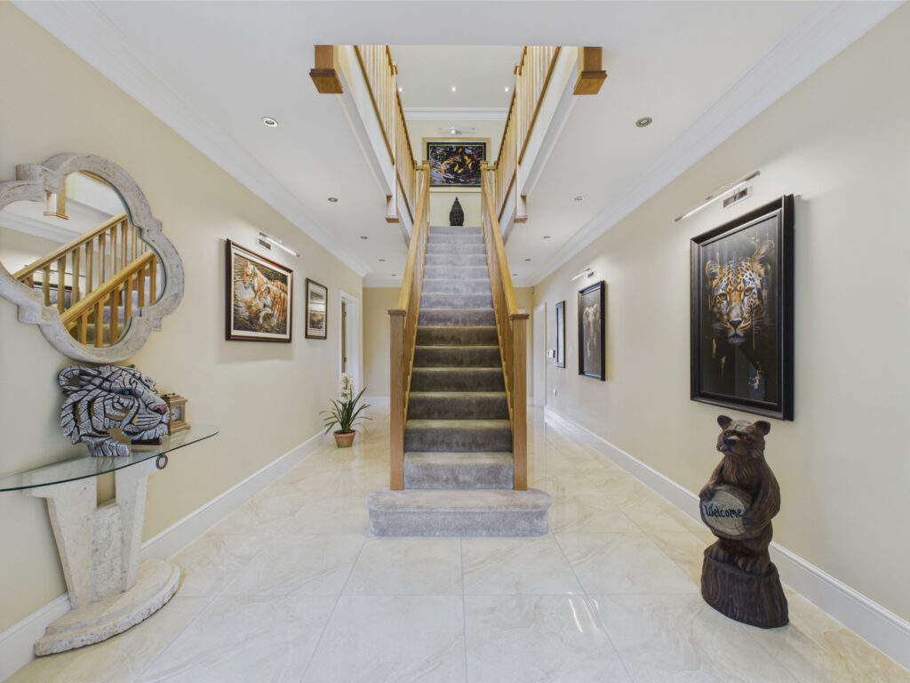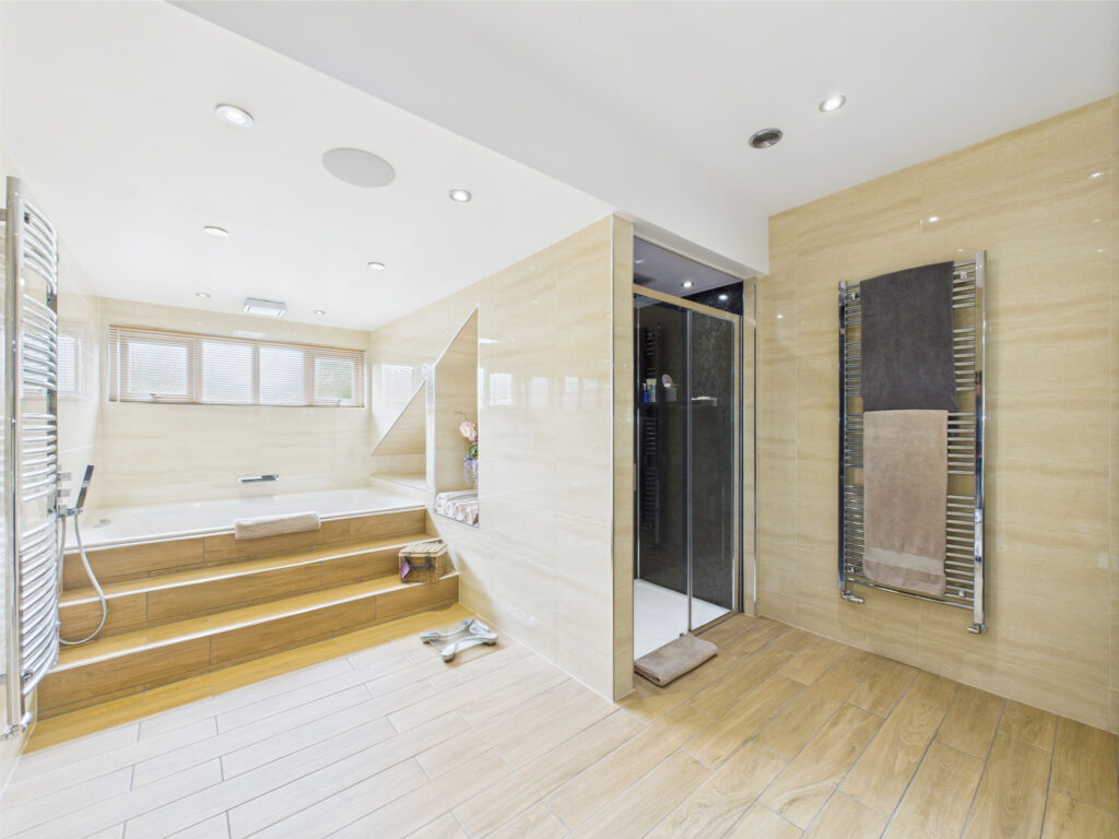 Ascending the beautifully crafted staircase to the impressive gallery landing, you’ll find a layout that has been thoughtfully designed with space and privacy in mind. The master suite is a standout feature — a luxurious retreat featuring a large arched window that floods the room with light, a bespoke dressing room, integrated eaves storage, and air conditioning for year-round comfort. The accompanying en-suite bathroom offers that wow factor and continues the home’s theme of luxury with sleek finishes and high-spec fittings. Complete with steps up a large sunken spa bathtub with chromotherapy lights and features an inbuilt tv to the wall, a walk in shower cubicle, his and hers wash hand basins and a low level wc. Two additional double bedrooms, both with private en-suites, provide excellent accommodation for family members or guests. While currently configured as a three-bedroom home, the generous proportions and smart layout allow for the potential to reconfigure the upstairs to create additional bedrooms if required — offering true flexibility for evolving family needs.