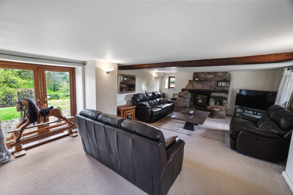 Externally for those looking to enjoy rural life, the contoured beautifully maintained gardens have decked seating patio area with lights and power, greenhouse,shed, mature fruit trees and raised planting beds with a babbling brook. Beyond the garden the additional enclosed 4.5 approximate acres is ideal for horses or simply grazing with a steam running through from afar.