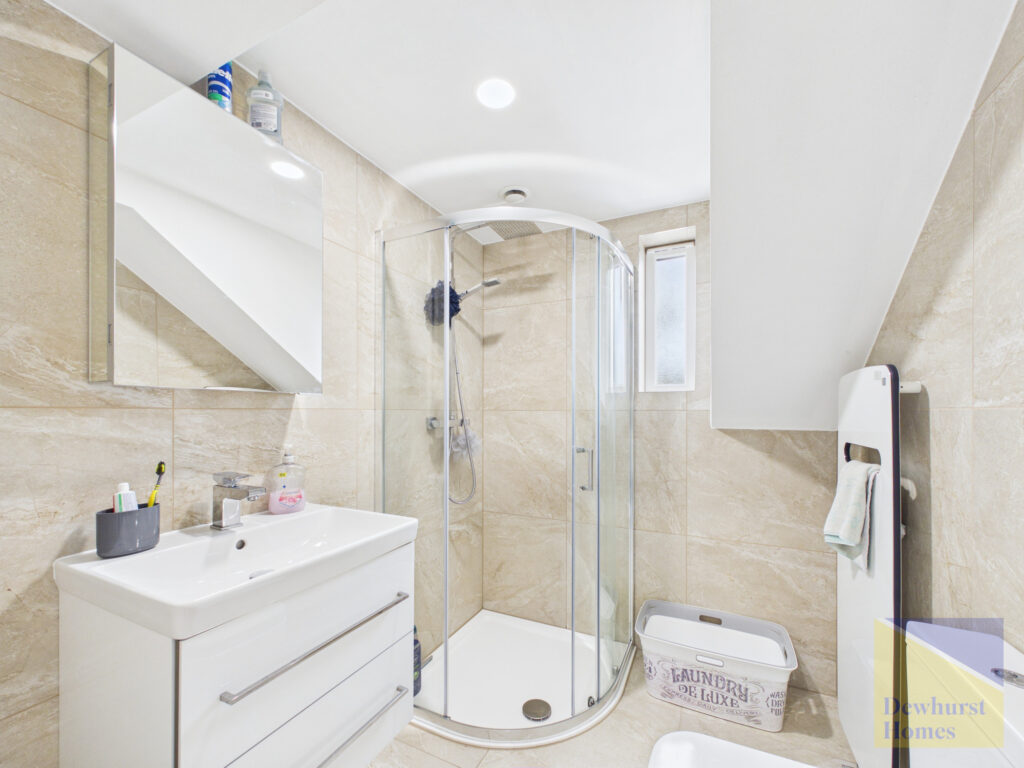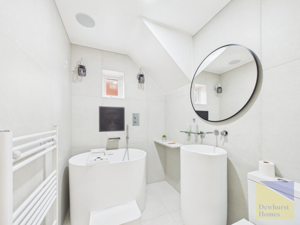 The ground floor also features a beautifully designed bathroom, fitted with a modern freestanding sink and an ultra-deep bath with a free-flow water spout, perfect for relaxation. A frosted sliding door adds both privacy and a sleek modern finish. In addition, there is a generous double bedroom on the ground floor, ideal for flexible living arrangements.