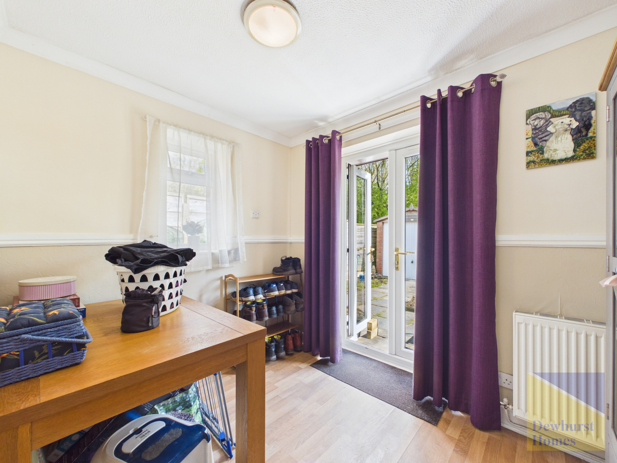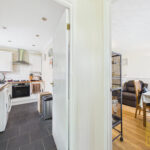 An inner hallway provides access to the remaining accommodation and includes further storage and loft access. There are two well-proportioned double bedrooms, both offering comfortable living space. The principal bedroom overlooks the rear garden and benefits from fitted wardrobes and cupboards, while the second bedroom enjoys French doors opening directly onto the garden, along with an additional side window, enhancing the sense of light and space.