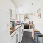 Upon entering the property, you are welcomed into a bright entrance hallway featuring a composite door with decorative leaded glass panels, a recessed door mat, and a useful built-in storage cupboard housing the boiler. The contemporary kitchen is fitted with a range of high gloss wall and base units, complemented by wood-effect work surfaces and tiled splashbacks. It includes an integrated electric oven and gas hob with extractor hood above, along with space for freestanding appliances. Additional features include an inset stainless steel sink with mixer tap, tiled flooring, inset ceiling lighting, and a UPVC double glazed window to the side aspect.