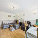 The spacious lounge is positioned to the front of the property and benefits from a large UPVC double glazed window, allowing for plenty of natural light. The room is finished with wood-effect flooring, decorative coving, dado rail detailing, and wall-mounted lighting, creating a warm and inviting living space.