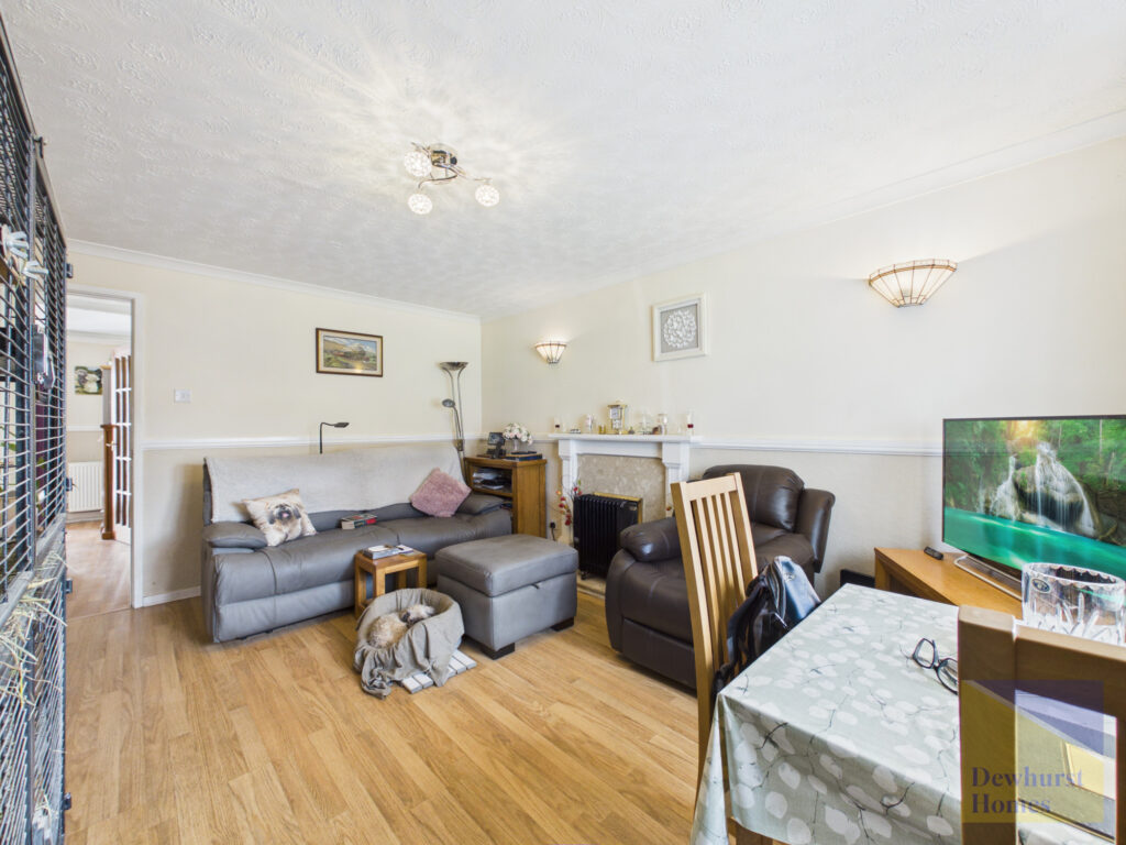 The spacious lounge is positioned to the front of the property and benefits from a large UPVC double glazed window, allowing for plenty of natural light. The room is finished with wood-effect flooring, decorative coving, dado rail detailing, and wall-mounted lighting, creating a warm and inviting living space.