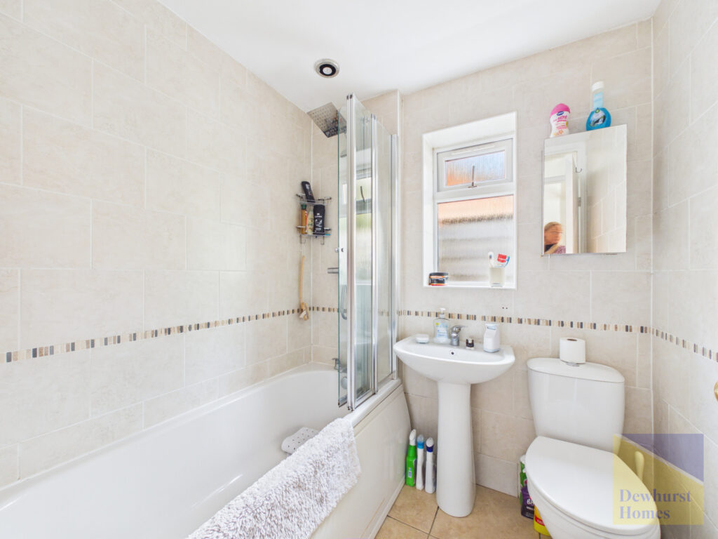 The bathroom is fitted with a three-piece suite comprising a low-level WC, pedestal wash hand basin with chrome mixer tap, and a bath with rainfall shower and glass screen. The room is fully tiled and also features a chrome heated towel rail, inset ceiling lighting, a medicine cabinet, and a frosted UPVC double glazed window.