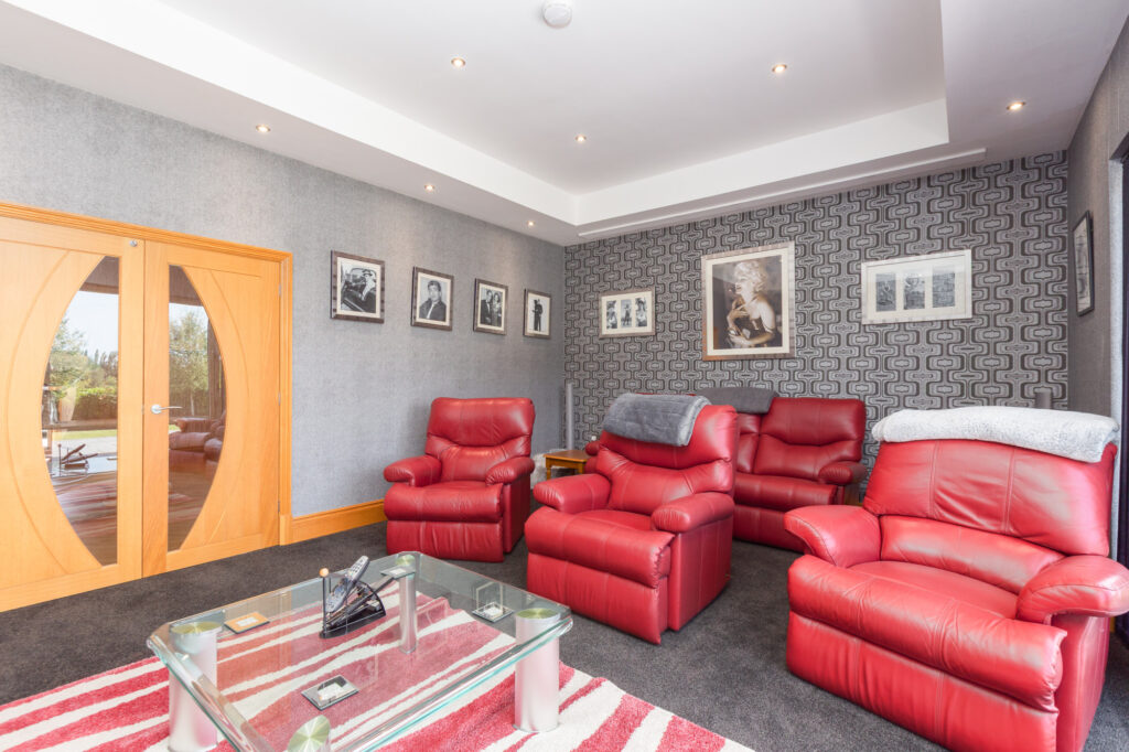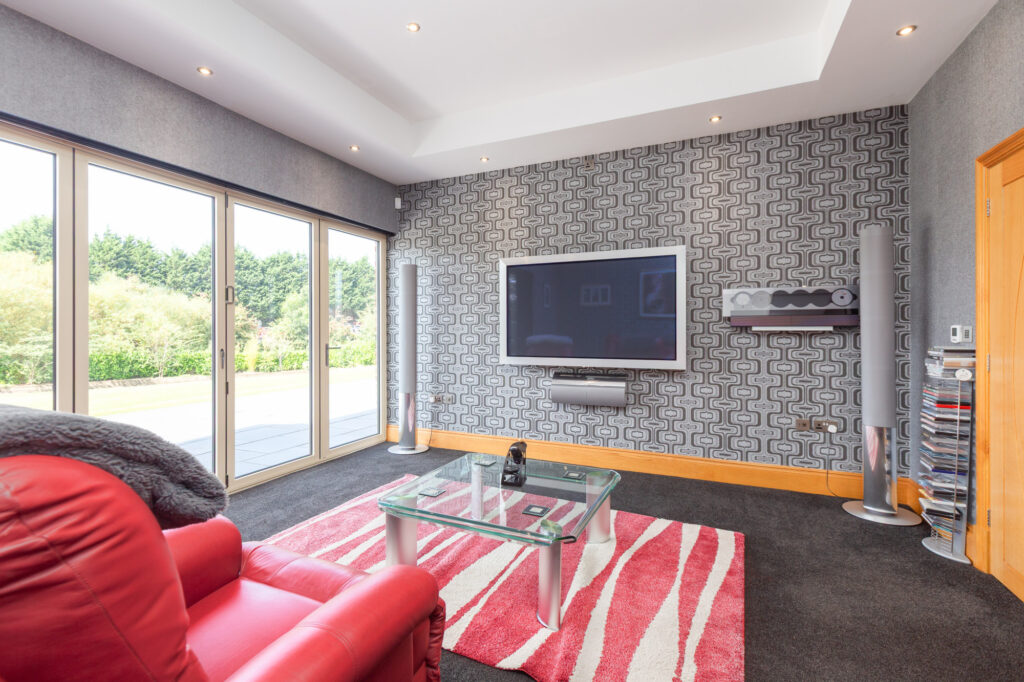 Two further reception rooms offer exceptional versatility. One is currently used as a cinema, while the other serves as a comfortable lounge. Both rooms feature bi-folding doors that open directly onto the large rear garden, creating a seamless indoor-outdoor connection and allowing for an abundance of natural light.