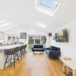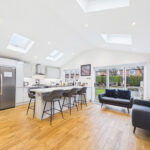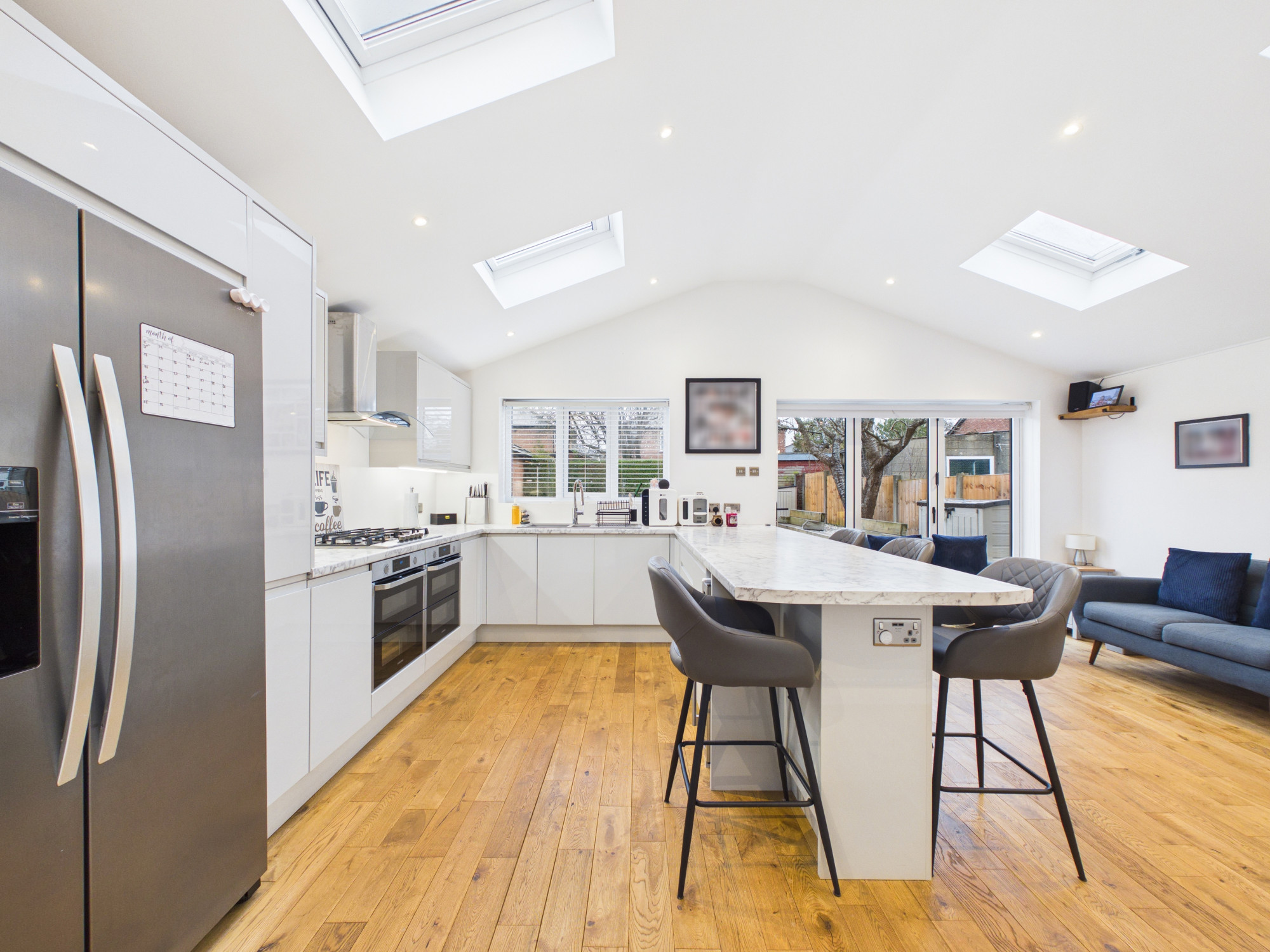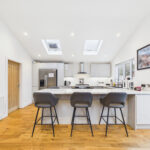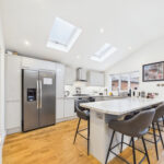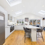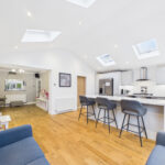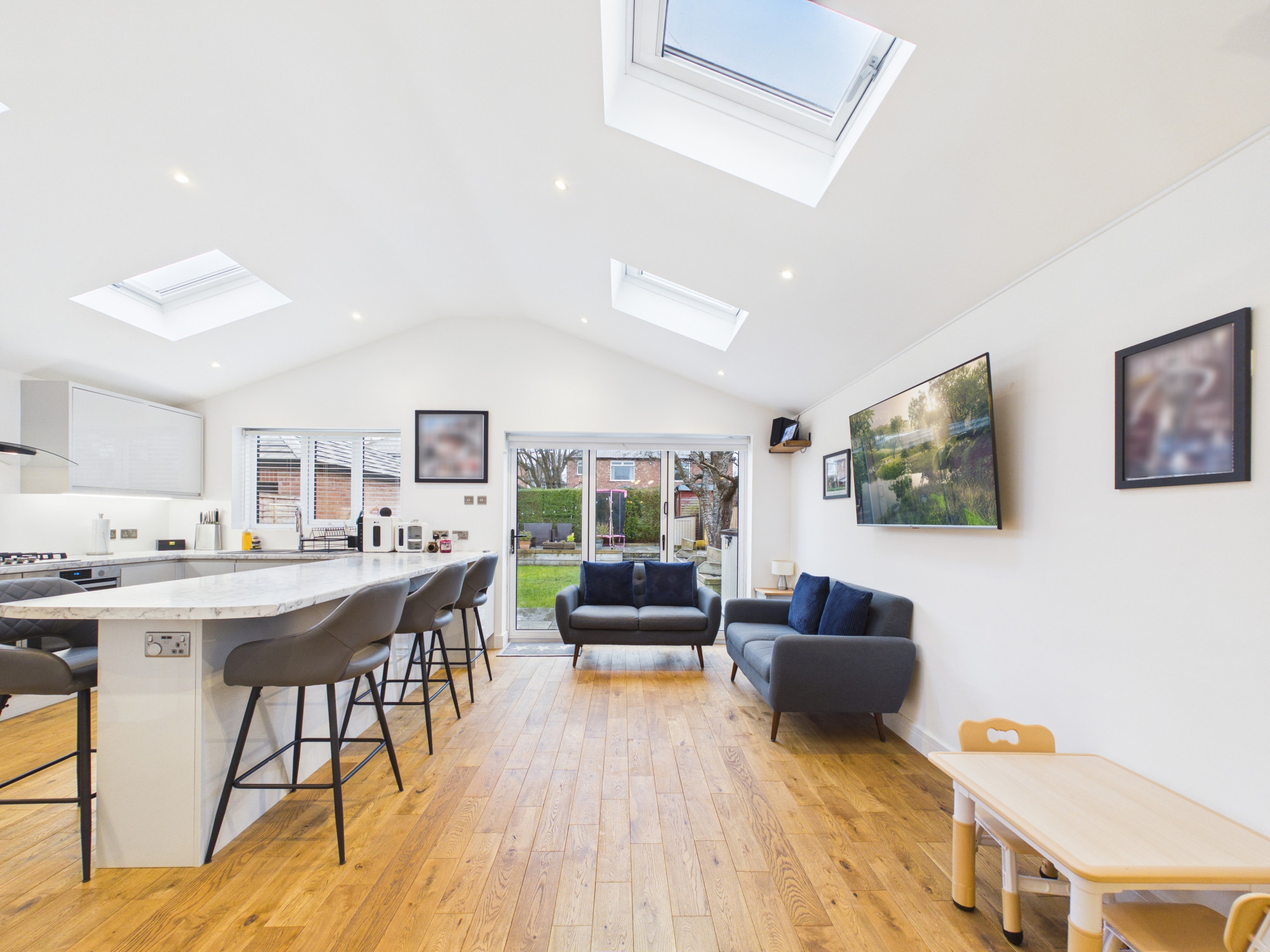 The stunning open-plan dining kitchen is the undisputed heart of the home, designed to impress while remaining wonderfully practical. With its full vaulted ceiling, four Velux windows and elegant engineered oak flooring, the room is flooded with natural light and exudes a sense of space and calm. Bi-fold doors blur the boundary between indoors and out, creating an effortless flow into the garden β ideal for entertaining, family gatherings or simply enjoying quiet moments at home.