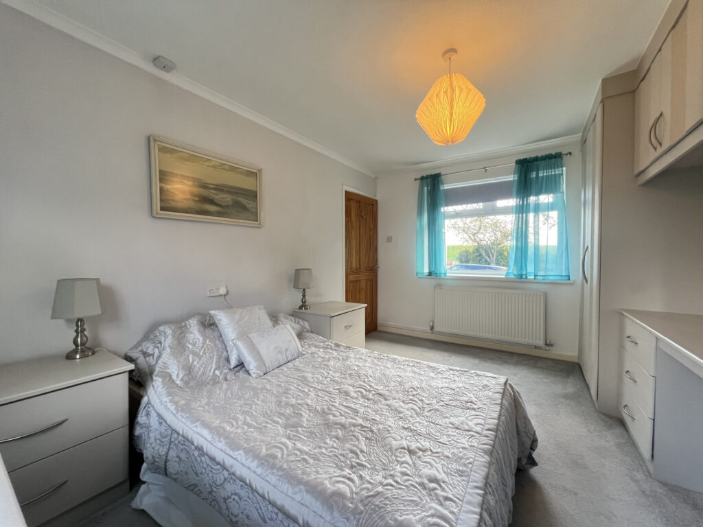 The property features a fitted kitchen, a spacious living room, and a modern bathroom with a walk-in shower, complemented by a practical utility room. The entrance hallway, enhanced by a skylight, creates a bright and welcoming first impression. There are two well-proportioned bedrooms, with the main bedroom boasting bespoke fitted wardrobes with matching chest of drawers and bedside tables providing ample storage. A standout feature of this property is the sun room, reconstructed in 2021, offering a lovely space to relax and enjoy views of the garden.