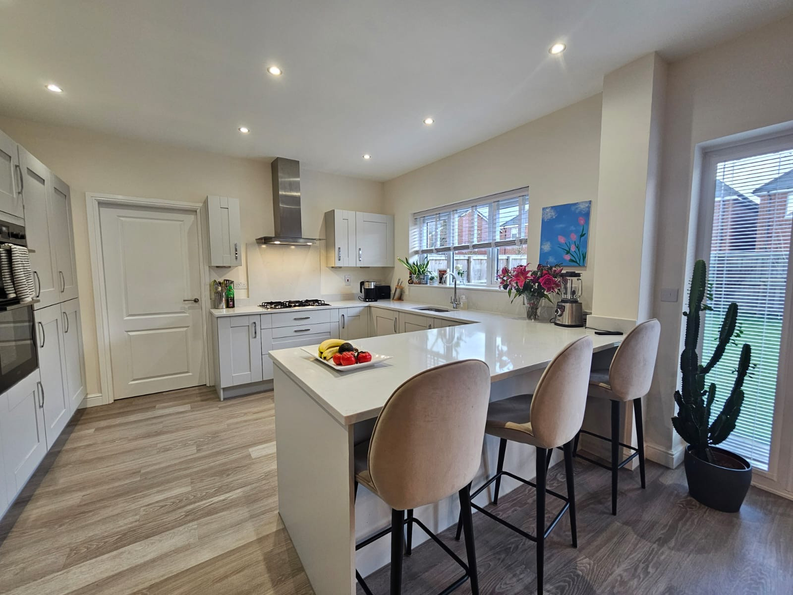 The ground floor features a bright formal lounge with an attractive bay window and a superb, open-plan kitchen/dining/family area, the true heart of the home, complete with French doors leading out to the landscaped and well-maintained rear garden. With upgraded appliances, KardeanΒ flooring and Quartz worktops. A separate utility/boot room with similar upgrades and cloakroom complete the ground floor.