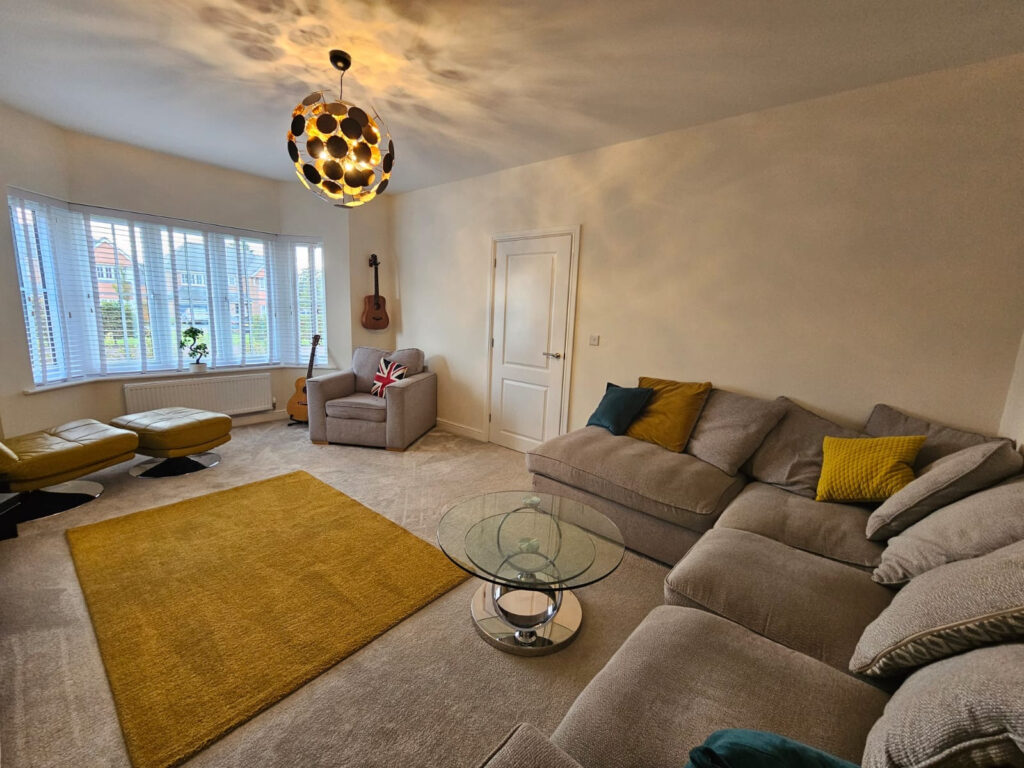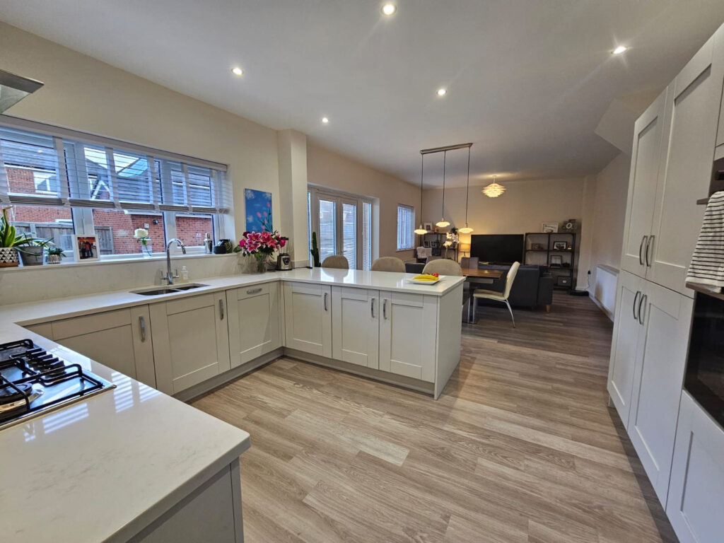 The ground floor features a bright formal lounge with an attractive bay window and a superb, open-plan kitchen/dining/family area, the true heart of the home, complete with French doors leading out to the landscaped and well-maintained rear garden. With upgraded appliances, Kardean flooring and Quartz worktops. A separate utility/boot room with similar upgrades and cloakroom complete the ground floor.