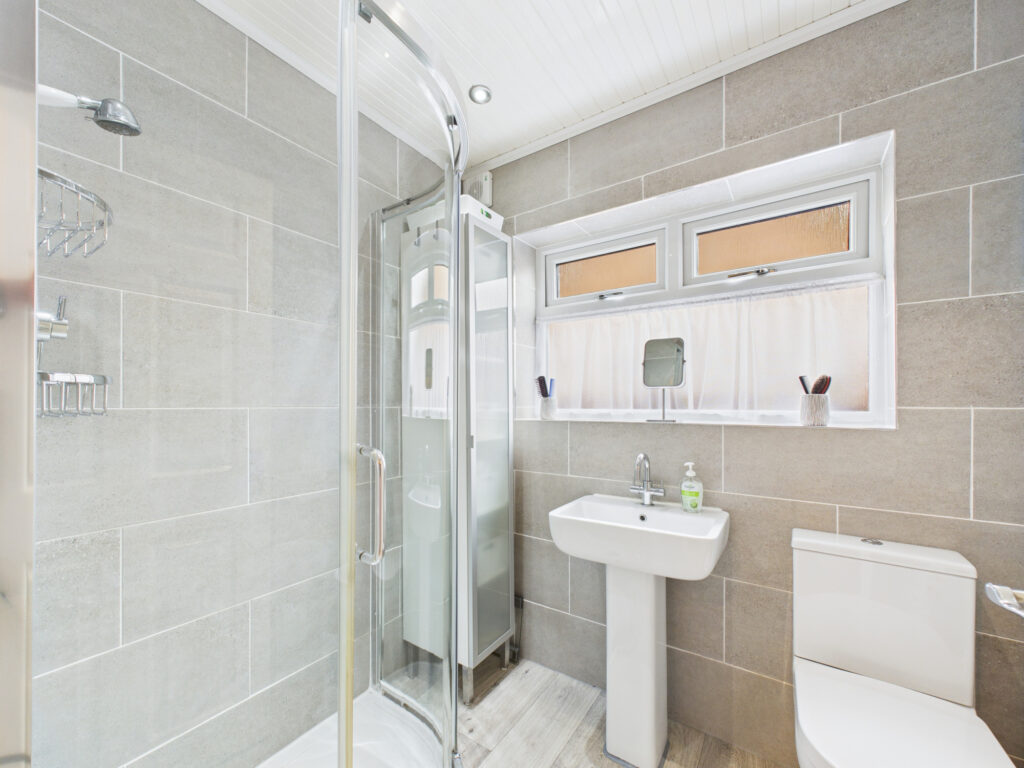 The ground floor also features two double bedrooms, both thoughtfully positioned and proportioned. The rear bedroom offers generous space and flexibility, while the front bedroom benefits from a built-in wardrobe with sliding mirrored doors — ideal for storage while keeping the room bright and open. The stylish and modern shower room completes the ground floor and features a contemporary three-piece suite including a walk-in shower enclosure, pedestal wash hand basin, and low-level WC, all finished with attractive, modern tiling for a crisp, clean look.