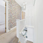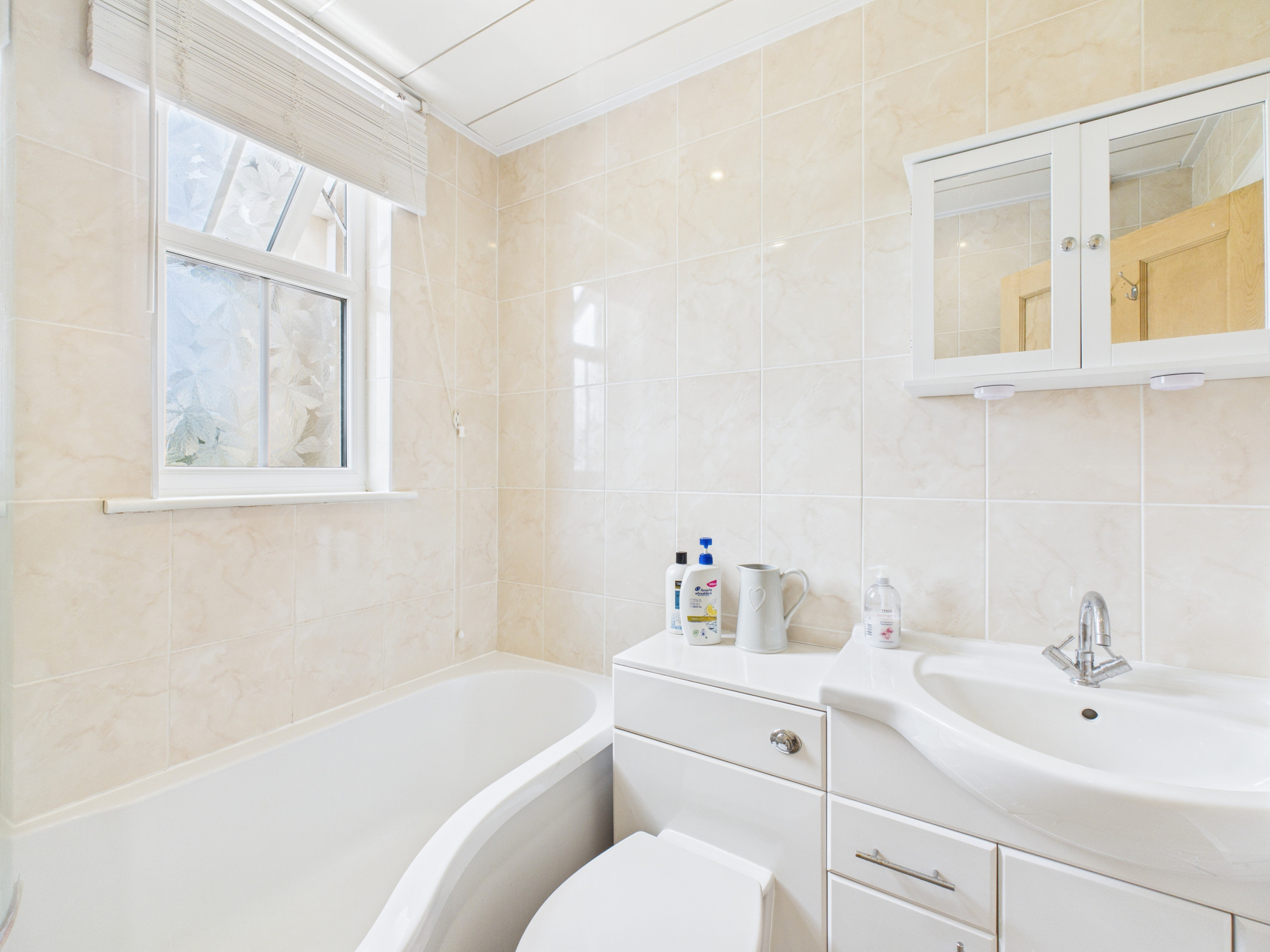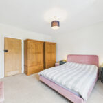 Upstairs, the split-level landing leads to three bedrooms and a modern family bathroom. The master bedroom is particularly impressive, spanning the full width of the property and offering ample space for wardrobes, seating, or even a home office area. The second and third bedrooms offer flexibility, perfect for children’s rooms, guest accommodation, or a dedicated workspace. The family bathroom includes a bath with shower over, wash basin, and low-level WC, all presented in a clean and contemporary style.
