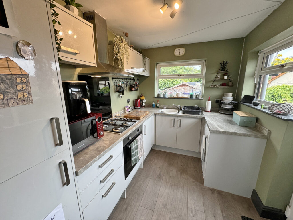 Upon entering, you are greeted by a welcoming entrance hallway leading to a cozy lounge featuring a striking focal fireplace, perfect for relaxing evenings. The spacious sitting/dining room provides an excellent space for family gatherings and entertaining. The modern fitted kitchen is well-appointed with contemporary finishes, catering to all your culinary needs.