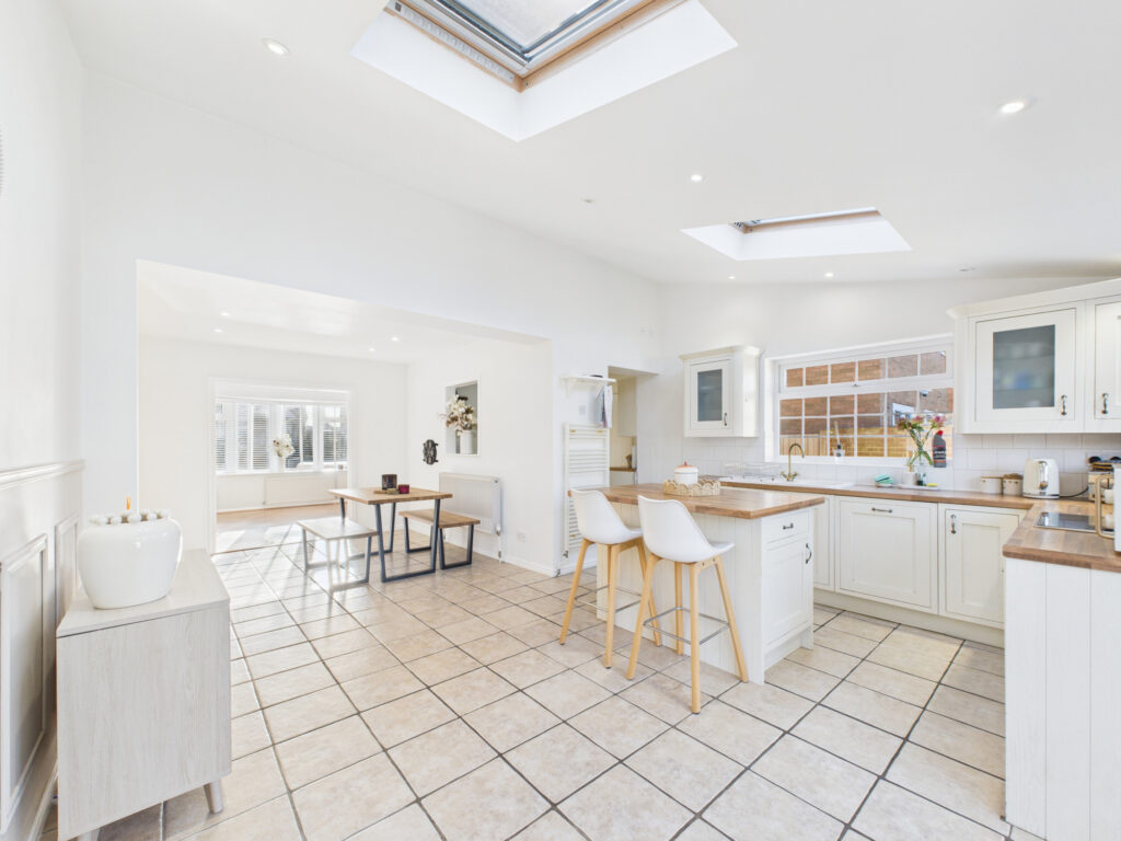 To the front of the property is a beautifully appointed living room, light-filled and inviting, providing an ideal space to relax. Moving through the home, the open-plan layout truly comes to life at the rear, where the dining area flows seamlessly into the extended breakfast kitchen, which spans the full width of the property. This impressive space forms the heart of the home and is perfect for both everyday family living and entertaining.