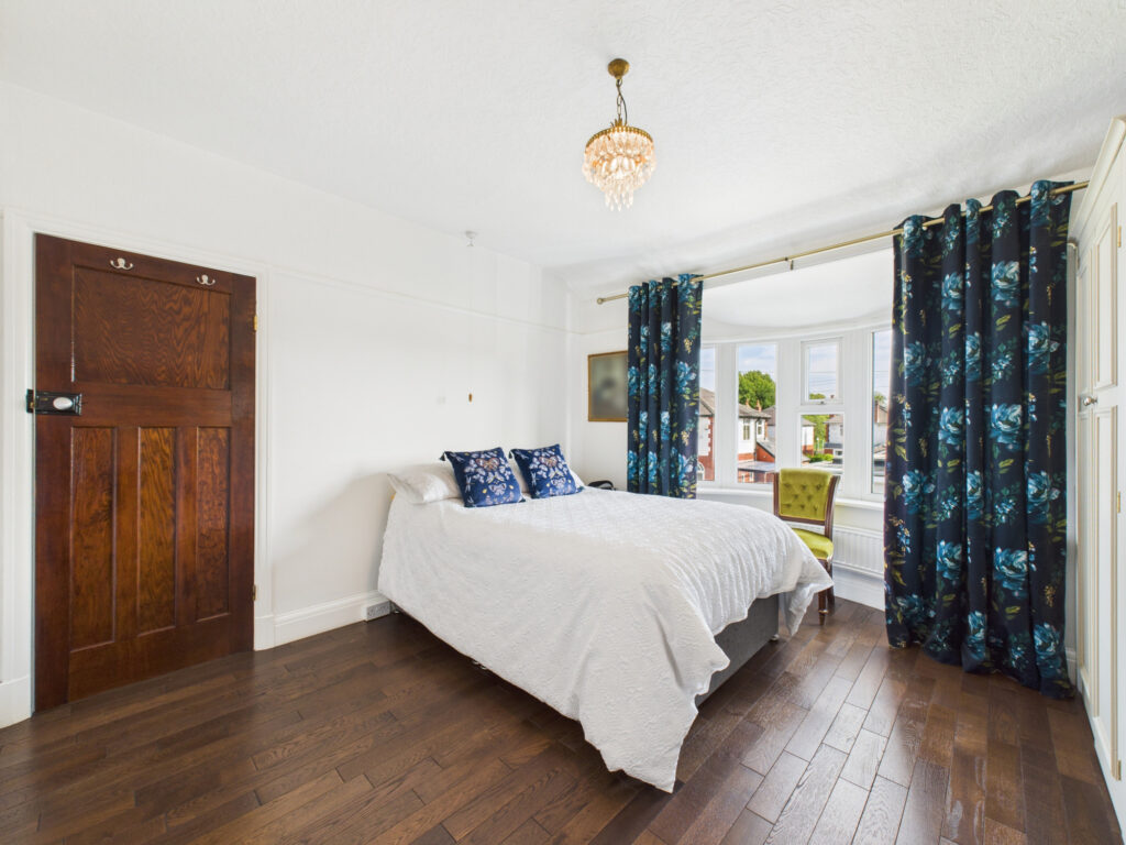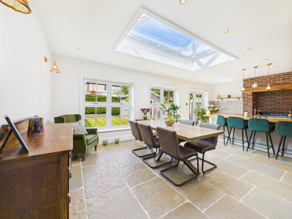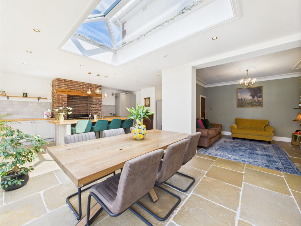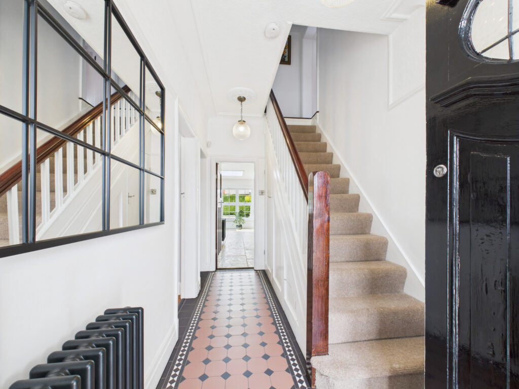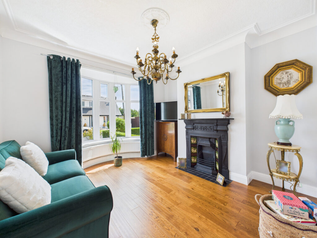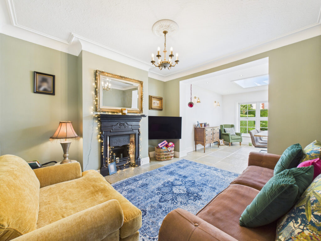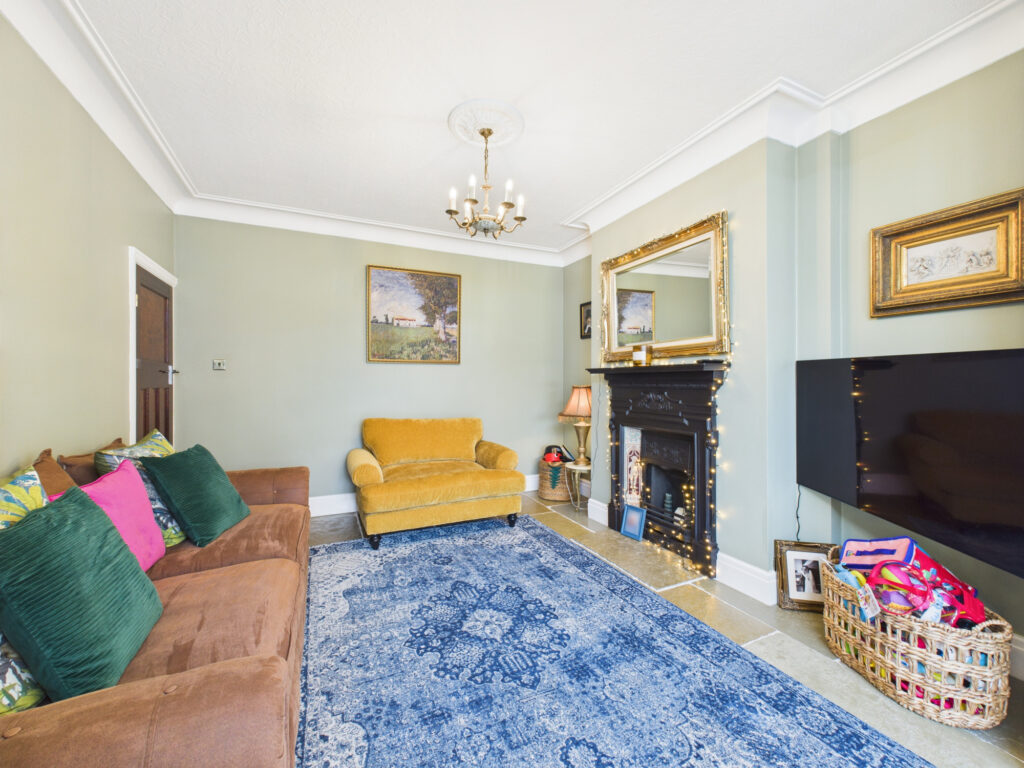 Step inside and you’re welcomed by a bright, elegant entrance hall that sets the tone for the rest of the home. Immediately to the left, the principal living room offers a tranquil retreat. Finished in soft, muted tones, this space is ideal for quiet evenings or more formal entertaining. A classic bay window enhances the room with natural light while maintaining a sense of privacy, and the generous proportions provide ample room for sofas and comfortable seating.
