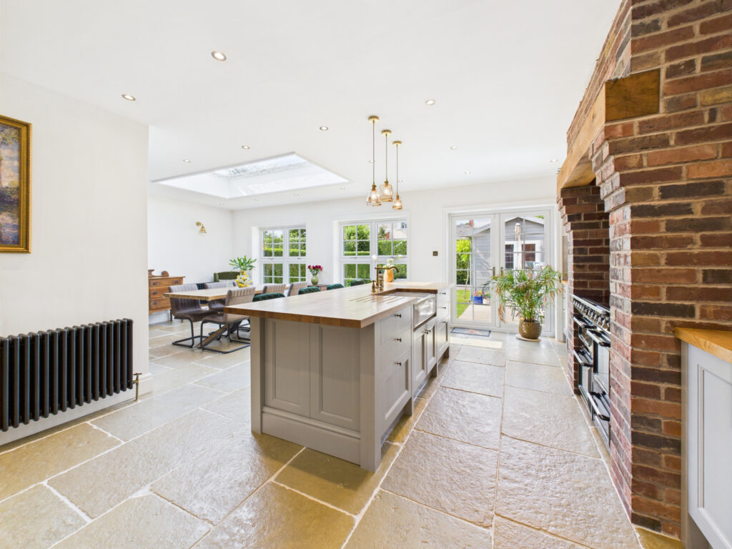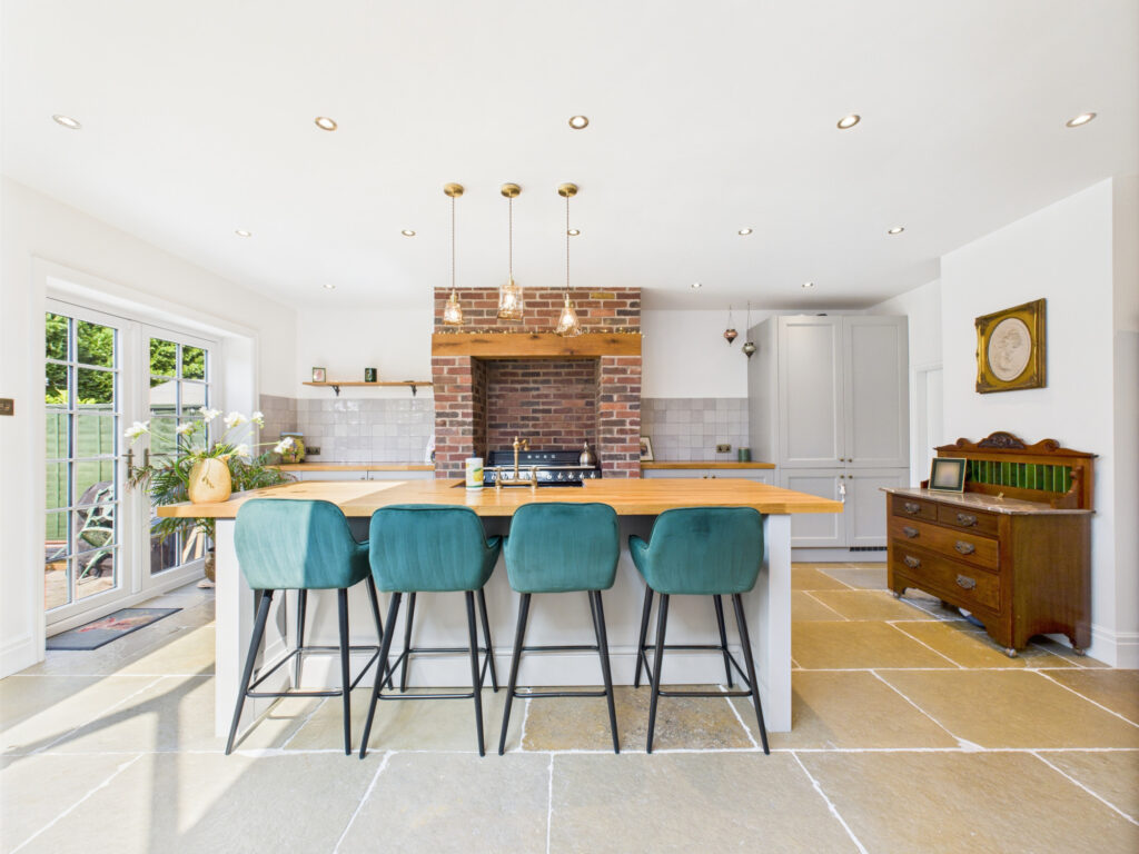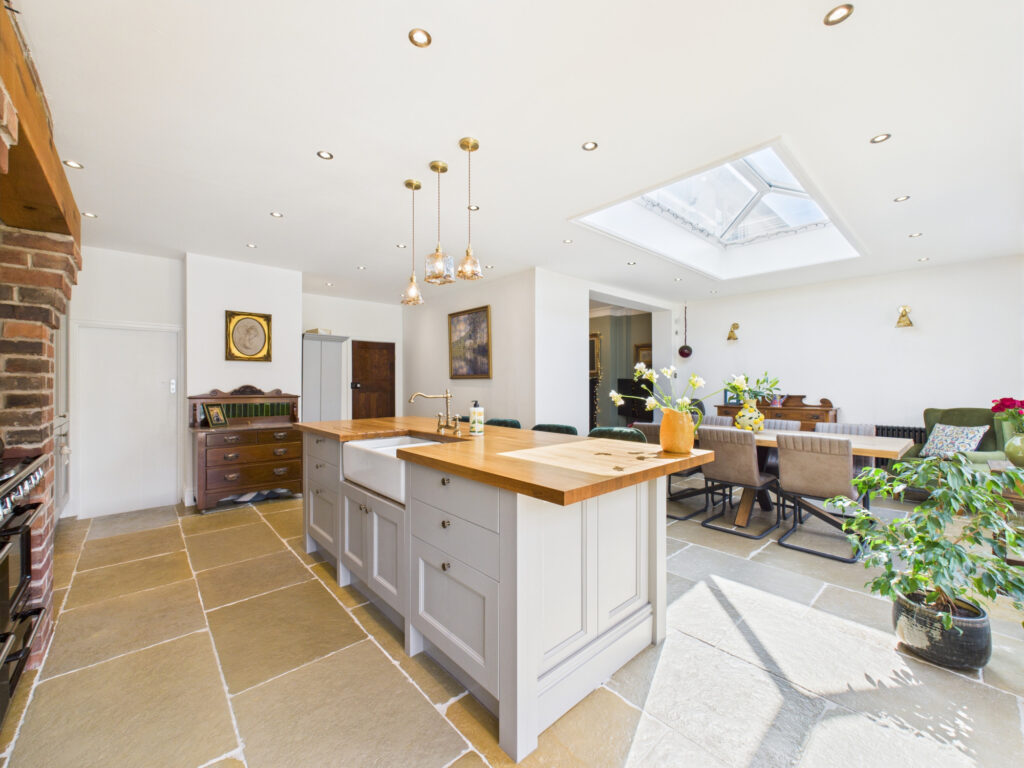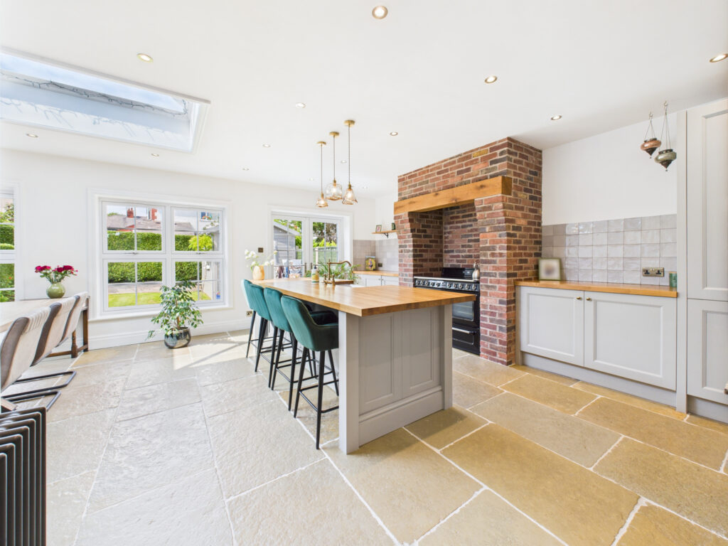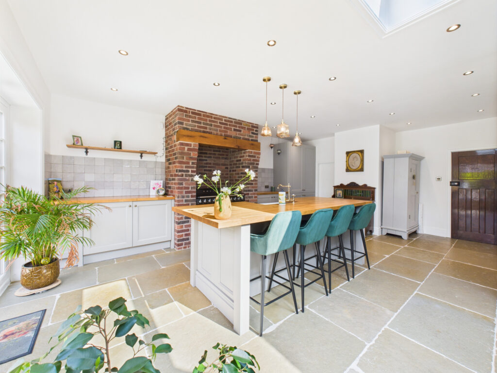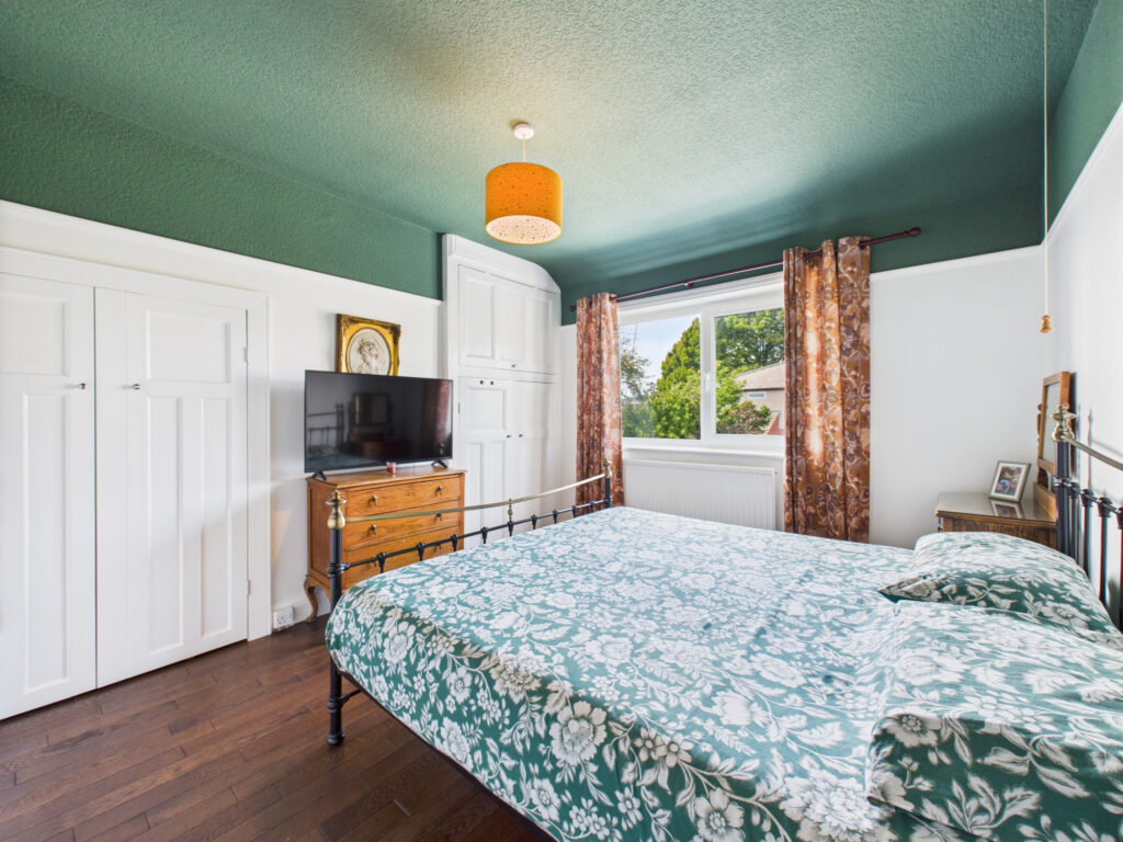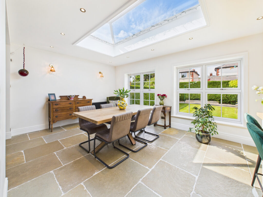 Step inside and you’re welcomed by a bright, elegant entrance hall that sets the tone for the rest of the home. Immediately to the left, the principal living room offers a tranquil retreat. Finished in soft, muted tones, this space is ideal for quiet evenings or more formal entertaining. A classic bay window enhances the room with natural light while maintaining a sense of privacy, and the generous proportions provide ample room for sofas and comfortable seating.