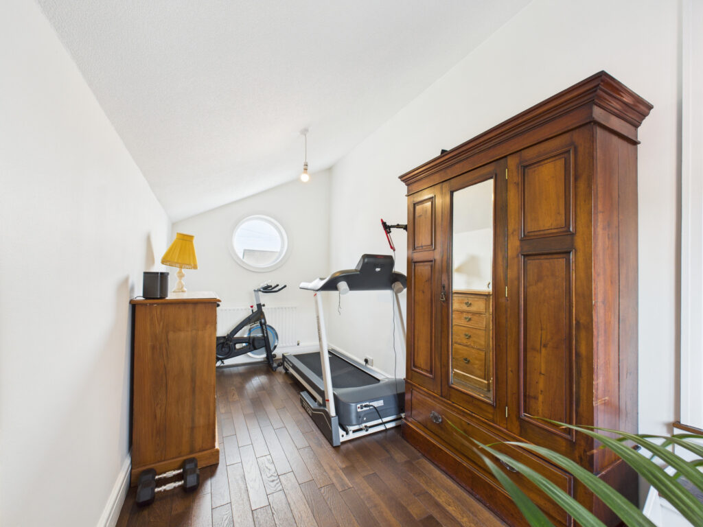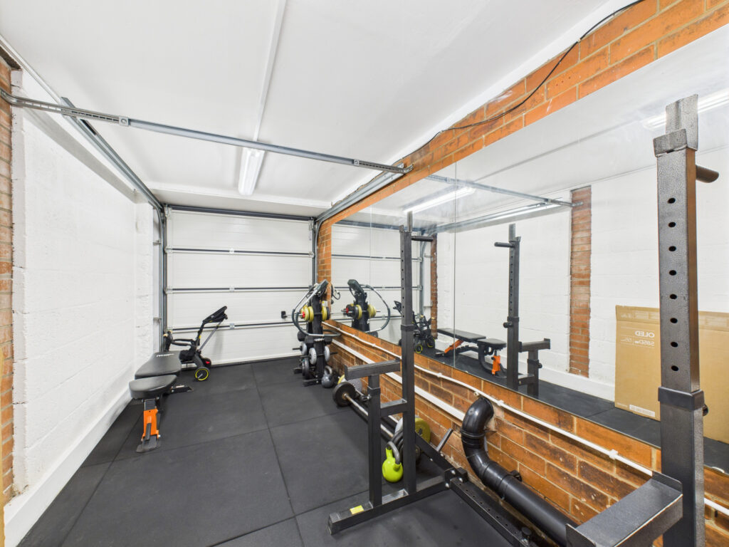 To the rear, the layout opens up into an expansive, open-plan family living space, the vibrant heart of the home. Bathed in natural light, this area has been thoughtfully designed with modern family living in mind. A harmonious palette of neutral colours and clean architectural lines creates a sense of calm and understated luxury. The bespoke kitchen features stylish cabinetry, high-spec integrated appliances, and extensive workspace for cooking and entertaining. A contemporary lantern roof elevates the space with light and height, while wide doors lead directly out to the garden for effortless indoor-outdoor flow. Adjacent to the kitchen, the dining area easily accommodates a full-size table, perfect for family meals or hosting guests. This flows seamlessly into a separate sitting area, ideal for relaxed evenings, a playroom or extra entertaining space depending on your needs. Also on the ground floor, you’ll find a contemporary two-piece cloakroom, stylish and practical for everyday family life and guests alike. Completing the ground floor layout is an integral garage, currently configured as a home gym.