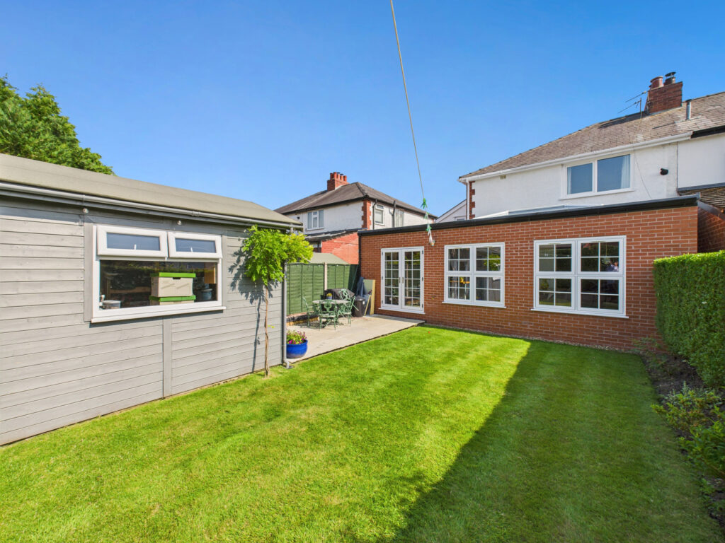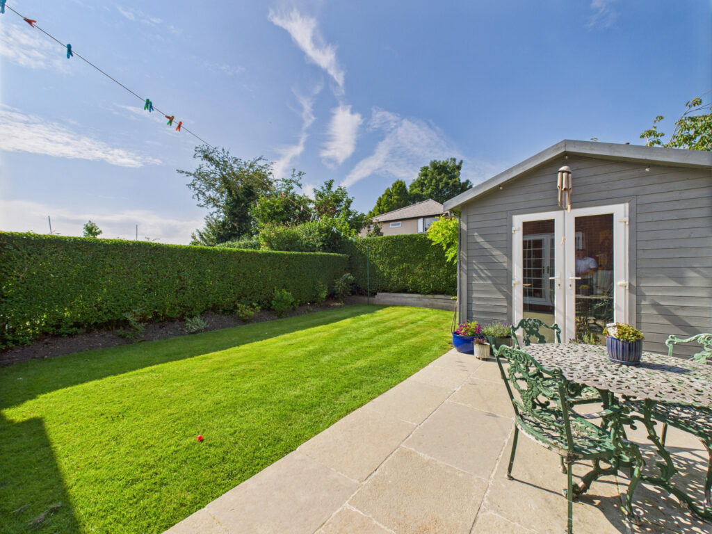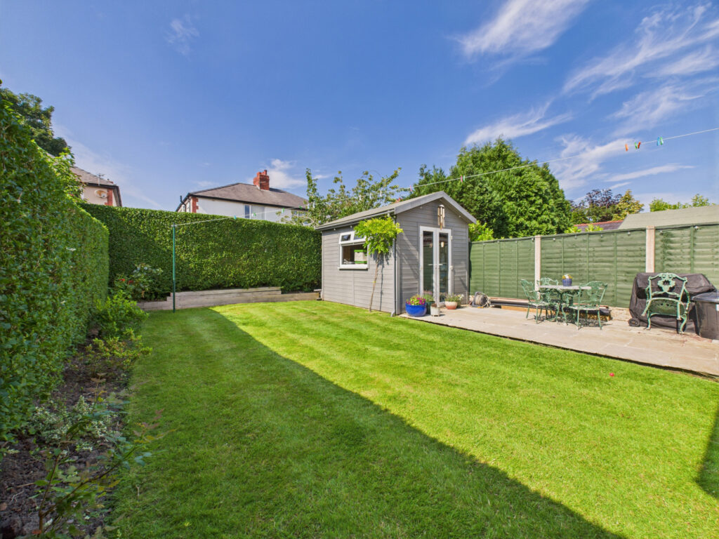Outside, the rear garden is a peaceful and private haven. Laid mainly to lawn and bordered by mature hedging, it provides plenty of space for children to play, pets to roam, or adults to dine and unwind. A charming timber summerhouse at the bottom of the garden offers yet more versatility; perfect as a home office, studio, gym, or simply a quiet spot to escape and relax.
