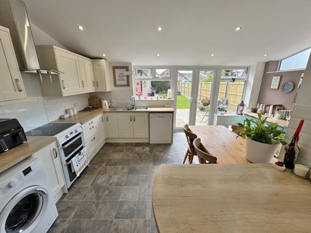 Extremely well-presented throughout, this home offers a seamless blend of style and functionality. Internally you will find a flowing floor plan and bright and airy accommodation arranged as follows: welcoming entrance hallway which leads to a charming bay-fronted lounge with a decorative fireplace and a welcoming dining room. A truly superb open-plan living and dining area that’s perfect for modern family life and entertaining guests. The kitchen is fitted with an abundance of matching wall and base units having complementary wood effect work surfaces and spaces to house a wide arrangement of kitchen/laundry appliances. A convenient two-piece cloakroom on the ground floor adds to the functionality of the space.