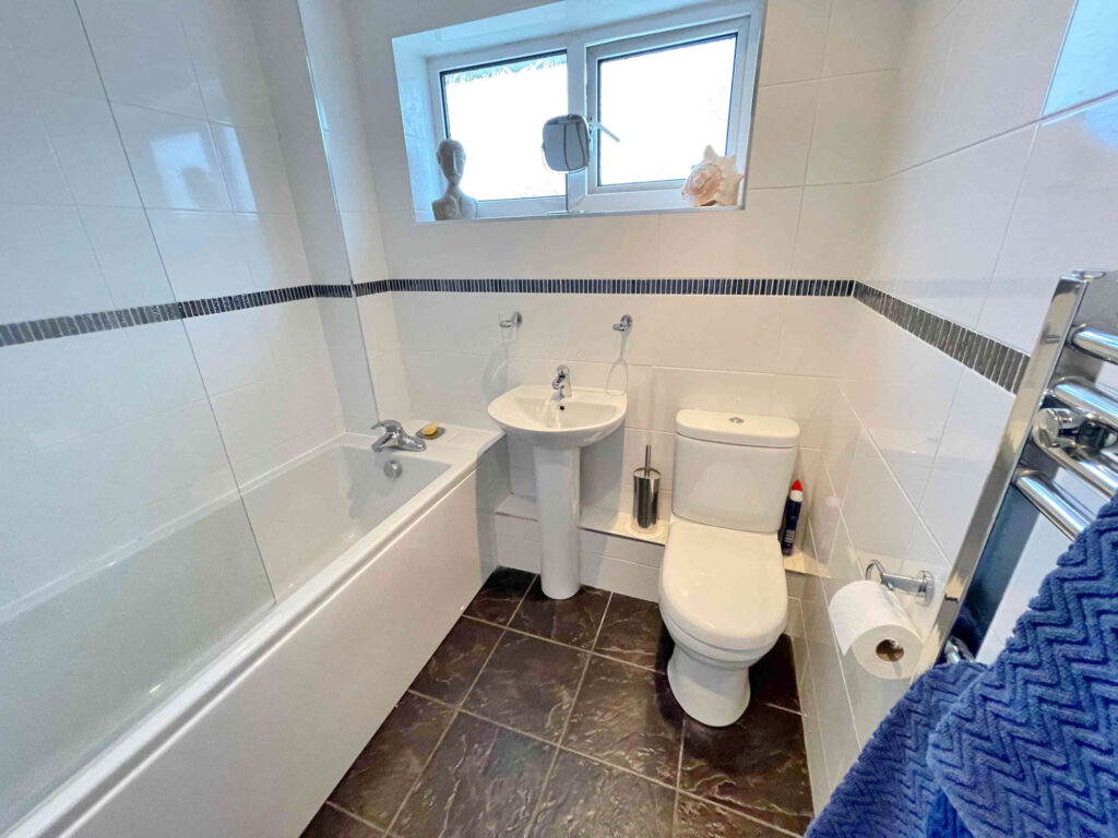 To the first floor, a central landing leads to three bedrooms, each offering comfortable accommodation with plenty of natural light. Whether used as bedrooms for a growing family, guest rooms or even a home office, these rooms provide excellent versatility. The accommodation is completed by a modern family bathroom, finished to angood standard with contemporary fixtures and fittings that create a relaxing environment.