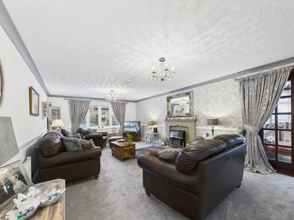 The entrance vestibule leads into a welcoming reception space, creating a warm first impression and an ideal introduction to the home. Beyond this, the principal living room is both generous and inviting, centred around an elegant feature fireplace which provides a natural focal point. Double doors open through to a delightful conservatory, flooded with natural light and offering uninterrupted views across the manicured gardens — a perfect space for relaxation throughout the seasons. Internally, further double doors connect the living room to a formal dining room, providing an excellent flow for both everyday living and more formal entertaining.