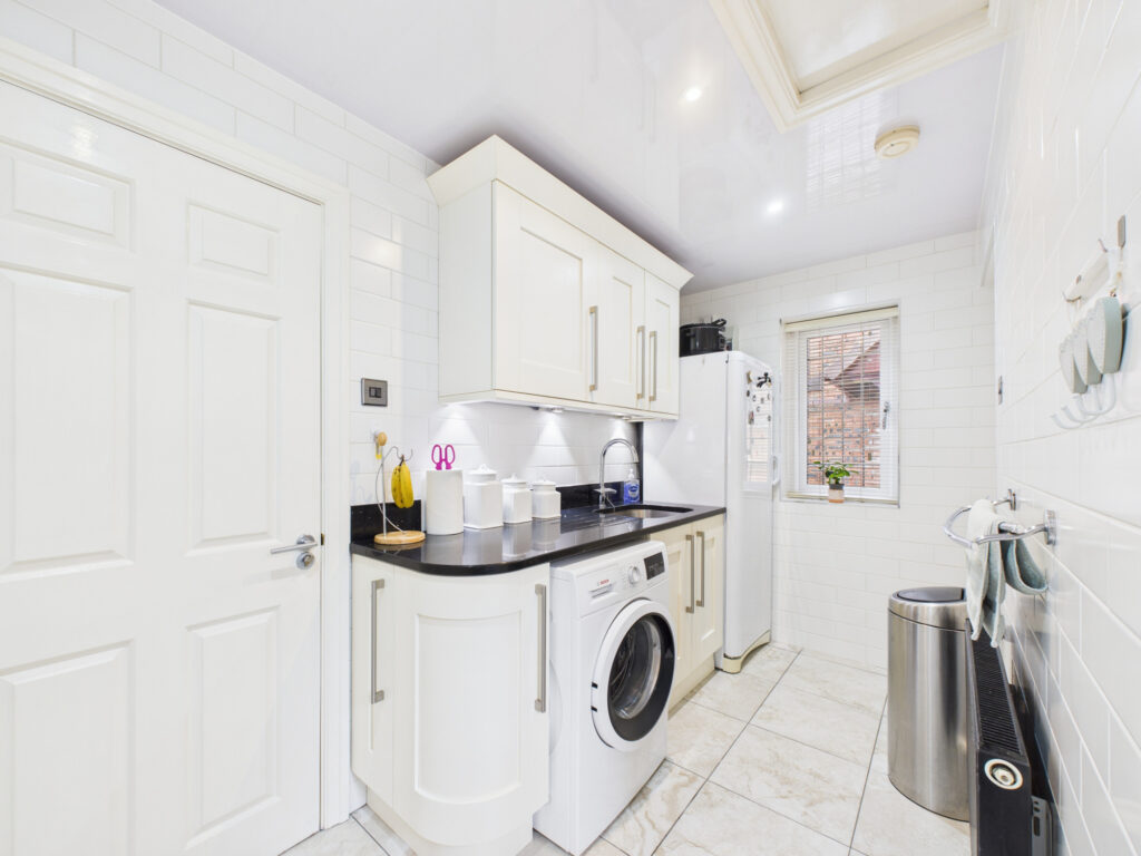 At the heart of the home lies the stunning breakfast kitchen, designed to meet the demands of contemporary living while retaining a refined aesthetic. Fitted with a comprehensive range of high-quality units and finished with sleek black granite work surfaces, the kitchen is equipped with an array of integrated appliances including twin ovens, a microwave, larder fridge and dishwasher. Ample space is provided for a dining table and chairs, making this a natural hub for family life. Adjacent to the kitchen is a highly practical utility room, again fitted with storage units and offering direct access into the integral double garage. Completing the ground floor accommodation is a dedicated home office, ideal for remote working and a two-piece cloakroom.