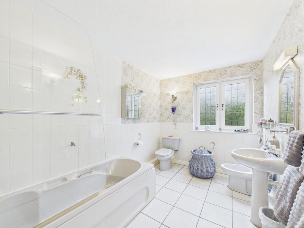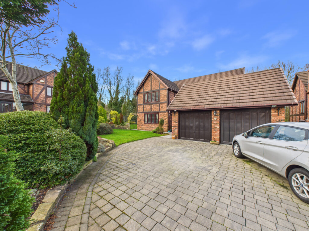 The exterior of the property is equally impressive and has been designed to complement the home’s sense of privacy and exclusivity. To the front, a private driveway provides ample off-road parking and leads to the integral double garage. The gardens, which extend to the side and rear, are beautifully landscaped and meticulously maintained, creating a serene and private outdoor environment. A standout feature is the elegant circular paved patio, perfectly positioned for outdoor dining, entertaining or simply enjoying the peaceful surroundings.