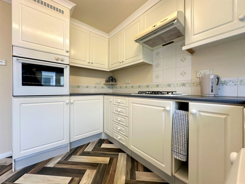 The property briefly comprises: large L shaped lounge with two bay fronted windows, electric fire with hearth and surround, access to kitchen with a range of wall and base units, gas hob with extractor over, waist height built in oven, space for washing machine and fridge freezer, sink with mixer tap and complimentary tiling, accessories, flooring and worktops. doorway from kitchen to outside area. Bathroom with w/c, hand wash basin, wall to wall bath, vanity unit and extractor. Two good sized bedrooms with fitted wardrobes and vanity units and en-suite to the master with double walk-in shower, built in vanity unit with hand wash basin and w/c and complimentary wall and floor coverings.