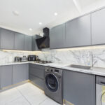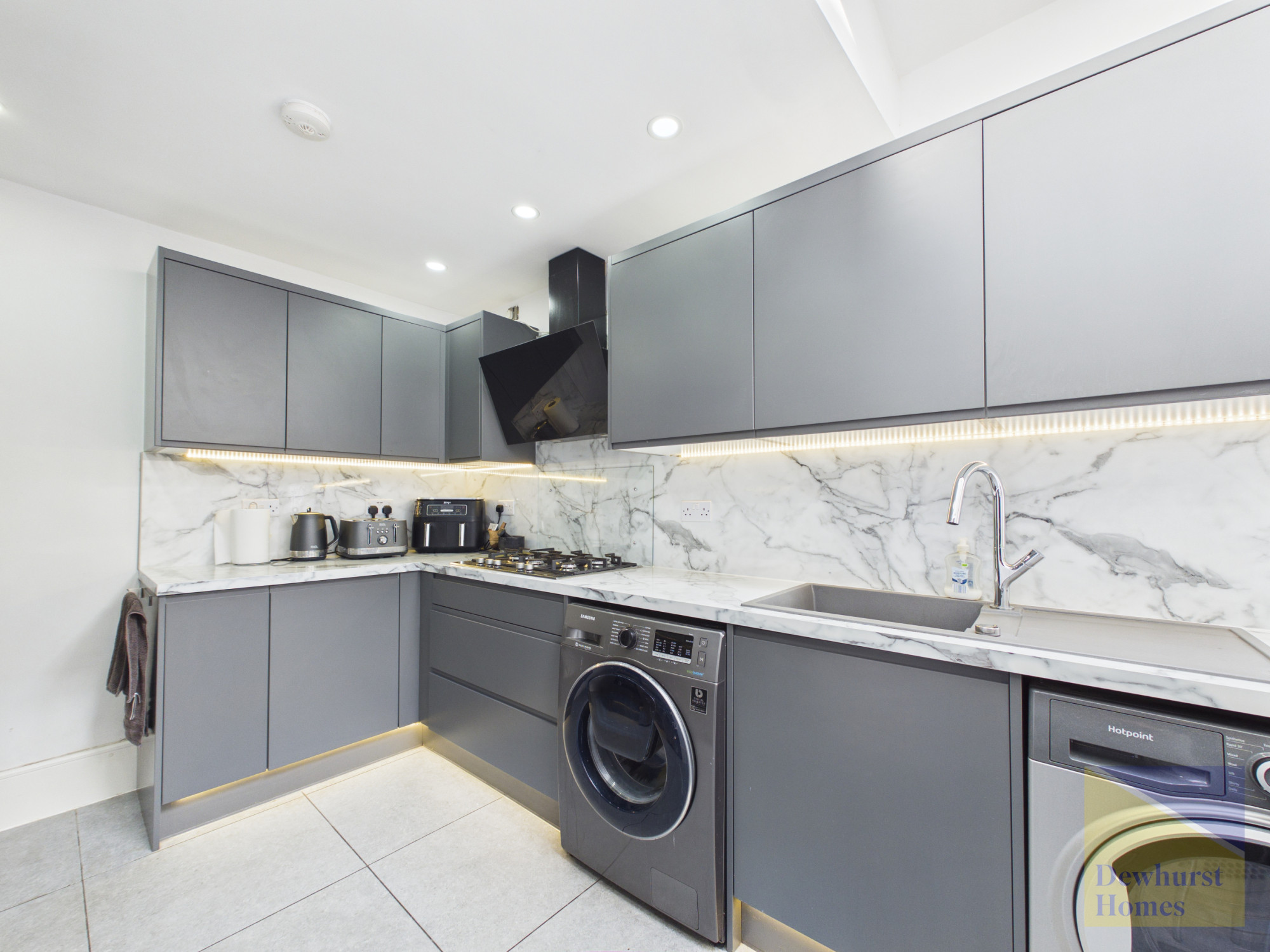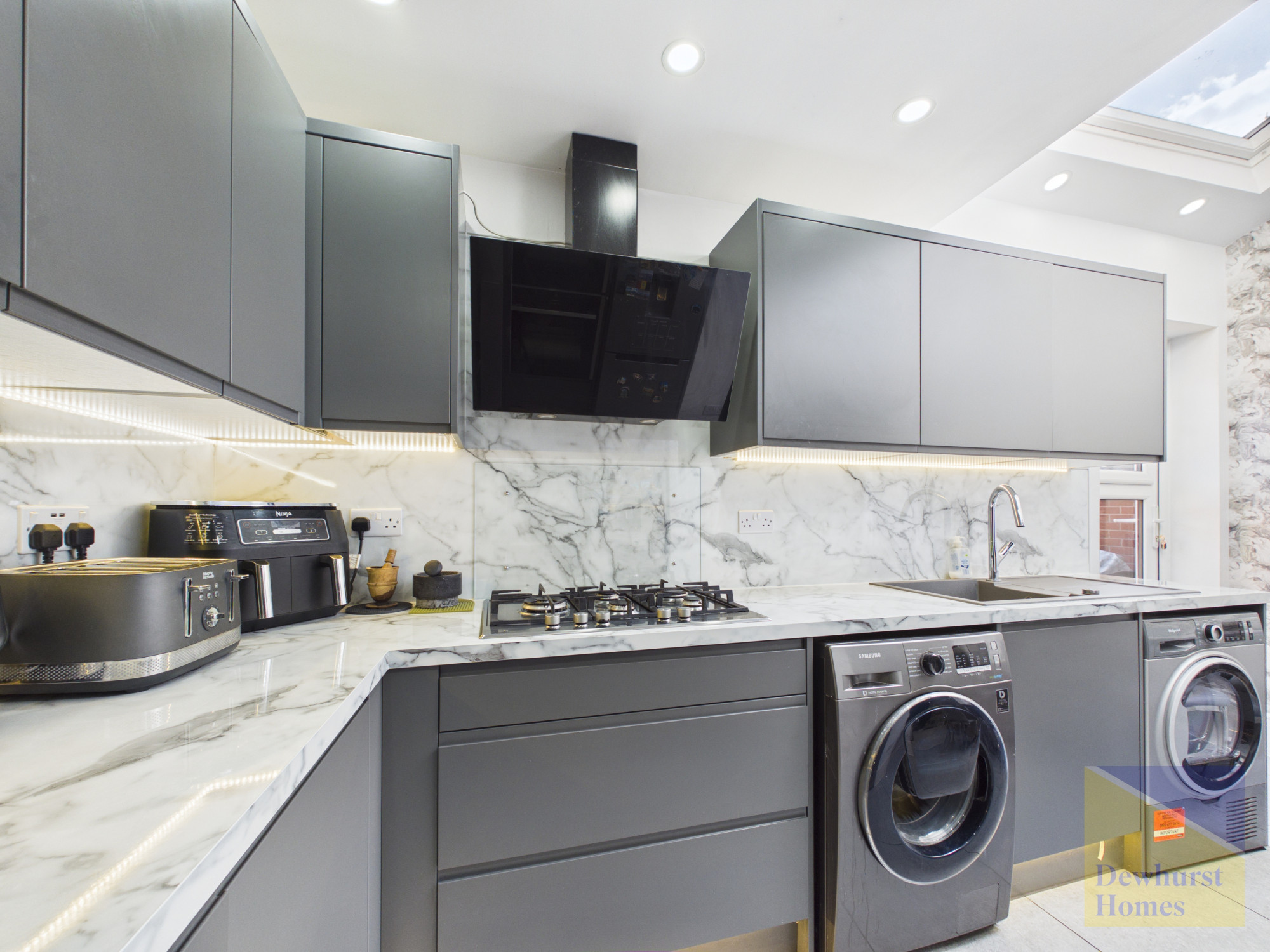 To the rear, the property opens into a stunning modern kitchen diner, thoughtfully designed with both style and practicality in mind. This impressive space features underfloor heating, a remote-controlled electric Velux window allowing for an abundance of natural light, and a charming stable-style back door. Additional highlights include a large pantry providing excellent storage and a tall decorative radiator that complements the contemporary design.
