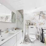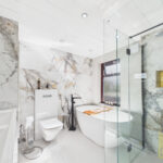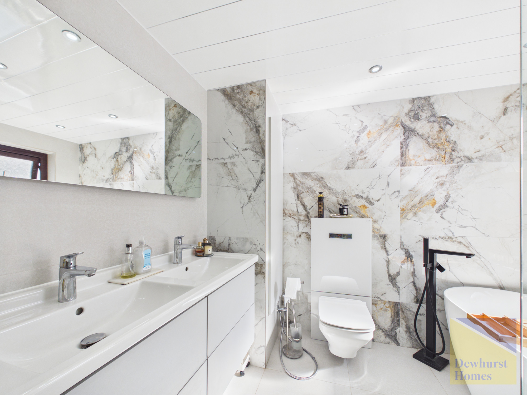 The family bathroom is truly a standout feature of the homeβfinished to an exceptional standard with full tiling throughout. It comprises his and hers vanity sinks, a luxurious freestanding bath, and a spacious double shower, creating a stylish and indulgent space.