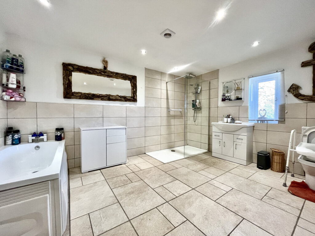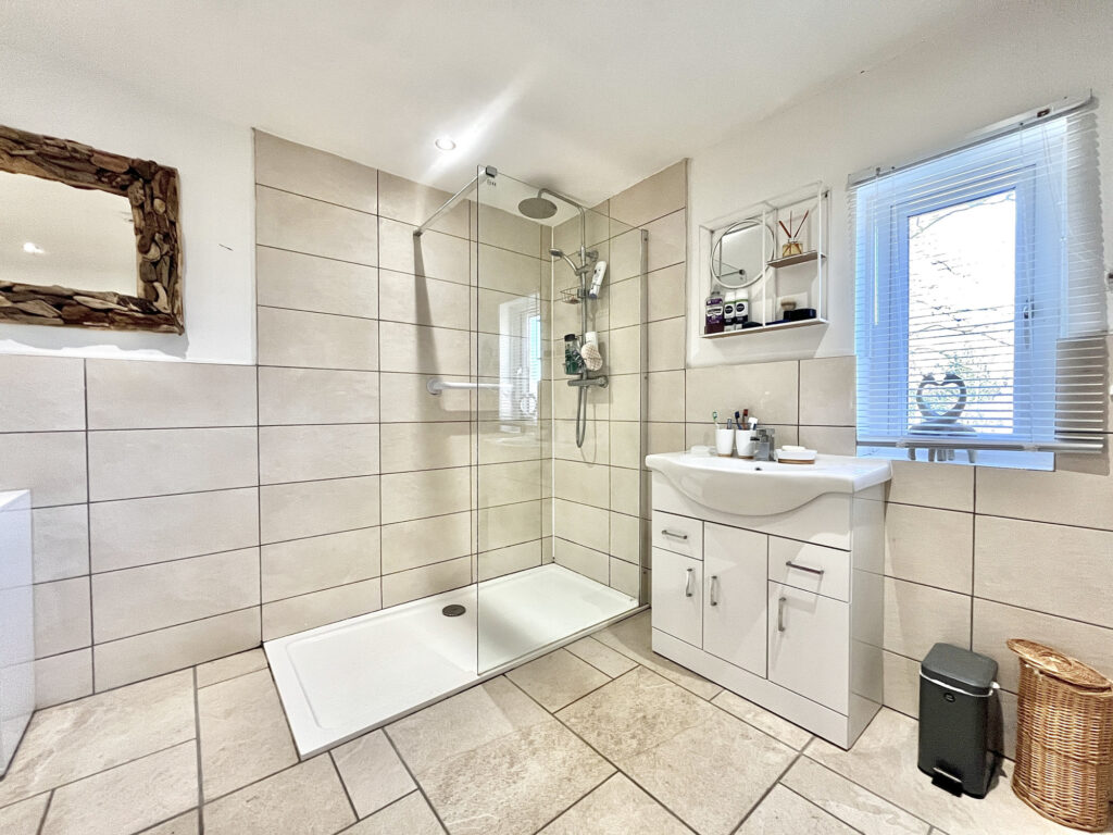Newly Refurbished Bathroom: The family bathroom has been tastefully modernized with contemporary fittings, including a luxurious bathtub, walk-in shower, and stylish fixtures. The design balances modernity with the farmhouse’s traditional character.