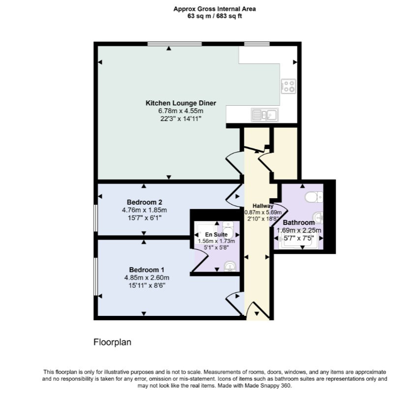 The property features a bright open-plan lounge and dining area, modern fitted kitchen, two double bedrooms including a main with en-suite, and a contemporary bathroom.